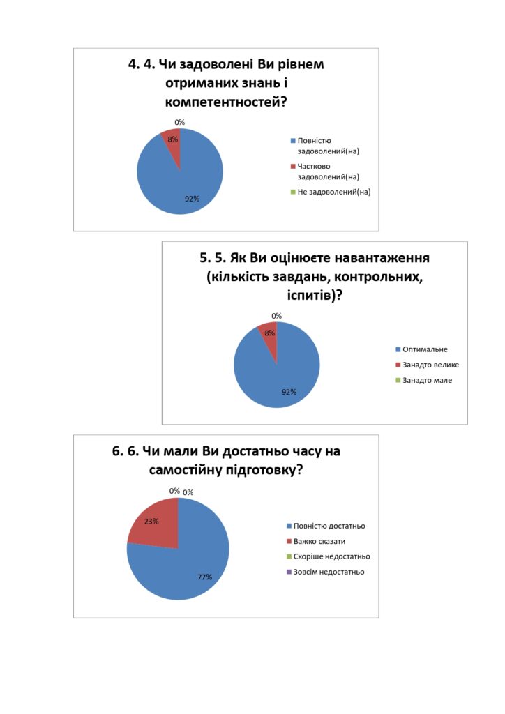 За результатами опитування, більшість респондентів позитивно оцінили загальну організацію освітнього процесу, зокрема: професіоналізм викладачів, доступність подачі матеріалу, навантаження, вільний вибір дисциплін з циклу професійної підготовки та загальноуніверситетського блоку. Серед побажань − актуалізувати зміст окремих освітніх компонентів відповідно до сучасних вимог роботодавців. Опитування також показало, що не всі здобувачі активно долучалися до обговорення ОПП, тому важливо й надалі розвивати механізми студентського залучення, формувати мотивацію до участі в обговоренні та впроваджувати інструменти, які сприятимуть більш активній взаємодії між усіма сторонами освітнього процесу.
