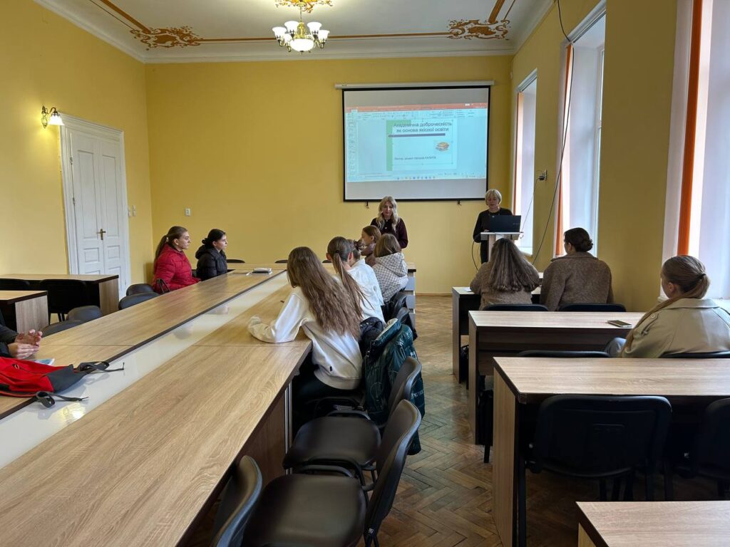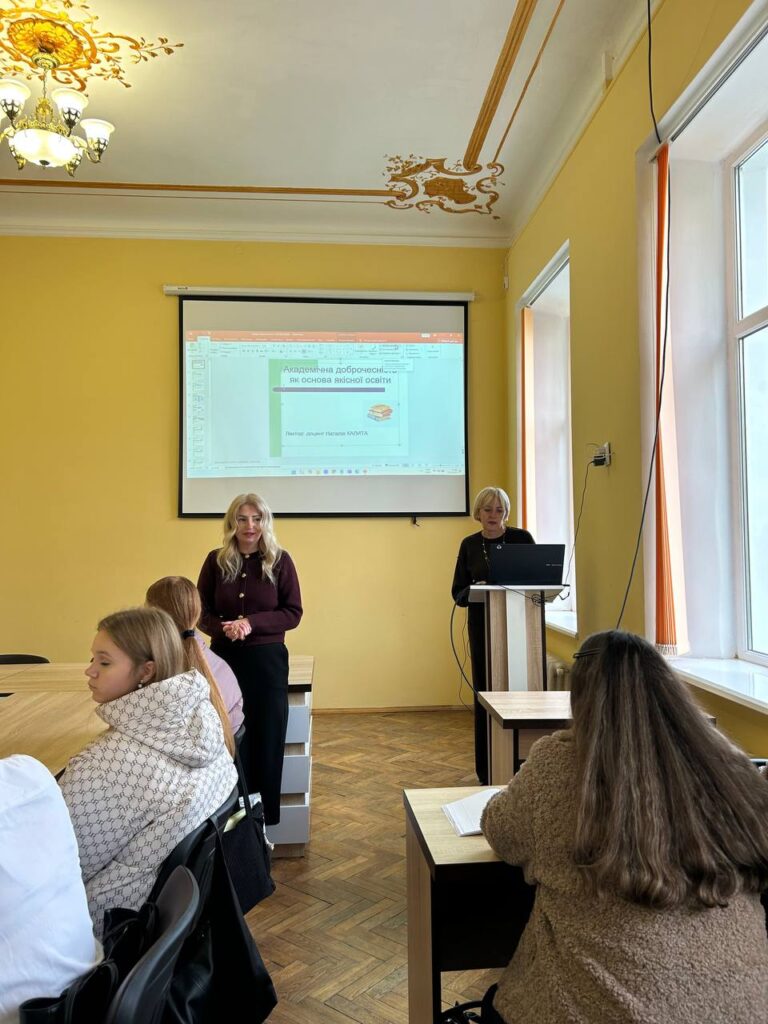 У рамках відзначення Міжнародного дня академічної доброчесності 16 жовтня на факультеті початкової освіти та мистецтва керівник наукового гуртка «Академічна доброчесність» доцентка Наталія Калита провела лекцію для здобувачів першого (бакалаврського) рівня вищої освіти на тему «Академічна доброчесність як основа якісної освіти».