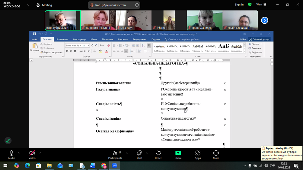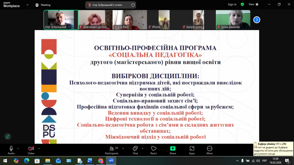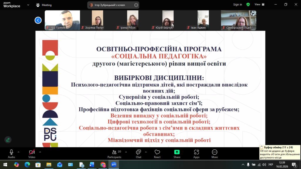 13 лютого в онлайн-форматі (платформа Zoom) відбулася робоча зустріч гарантів та розробників ОПП «Соціальна педагогіка» першого (бакалаврського) та другого (магістерського) рівнів вищої освіти зі стейкхолдерами – представниками професійної спільноти, роботодавцями, випускниками та здобувачами освіти.