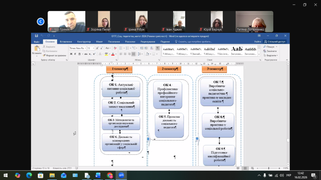Під час зустрічі було обговорено питання оновлення змісту освітніх компонентів, удосконалення переліку загальних і фахових компетентностей, розширення практичної підготовки здобувачів освіти й активізації співпраці з базами практики. Окрему увагу приділено відповідності програм сучасним викликам соціальної сфери, зокрема потребам підтримки вразливих категорій населення в умовах воєнного та поствоєнного періоду.