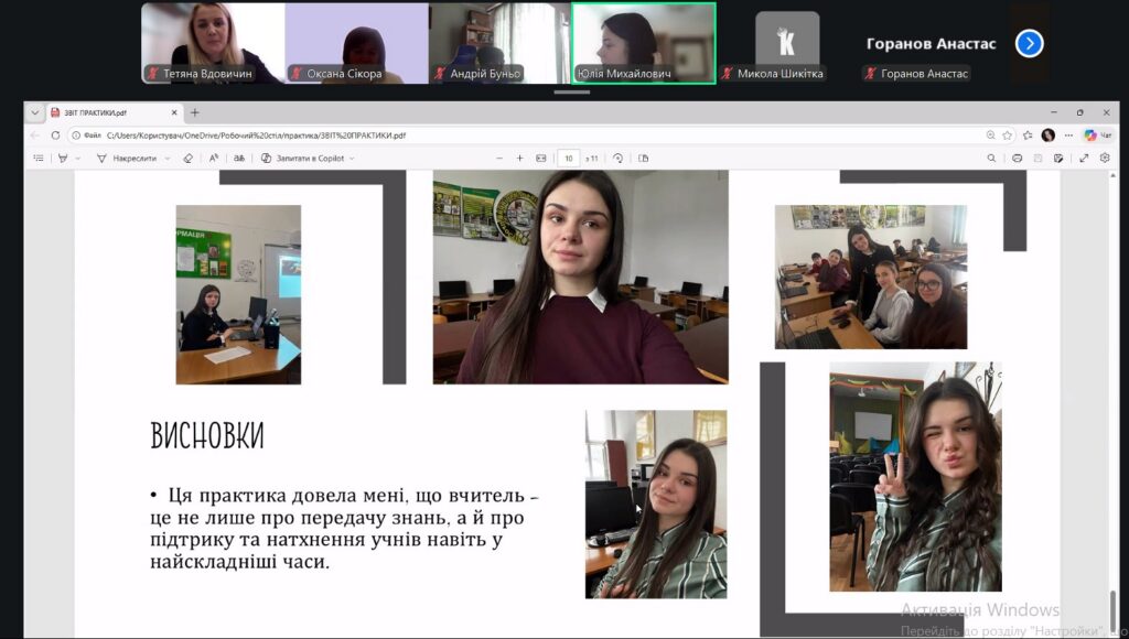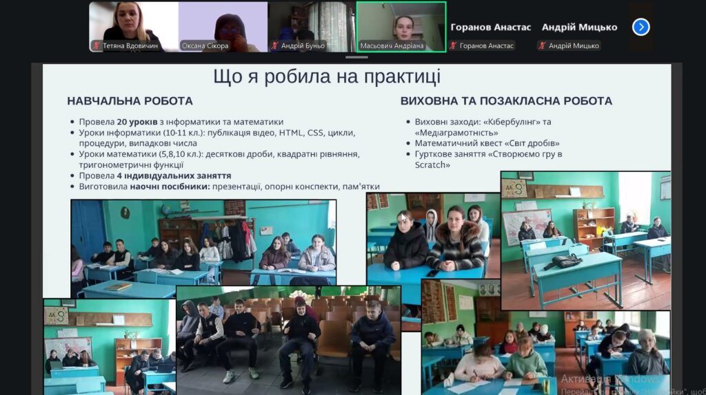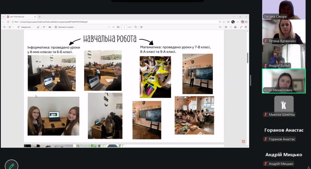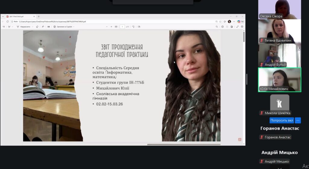 Захист практики студентів 4 курсу, що навчаються за освітньою програмою «Середня освіта (Інформатика, математика)», відбувся в теплій та професійній атмосфері. Студенти поділилися своїми враженнями від проходження педагогічної практики, розповіли про перші уроки, труднощі, несподівані ситуації та маленькі перемоги у роботі з учнями.