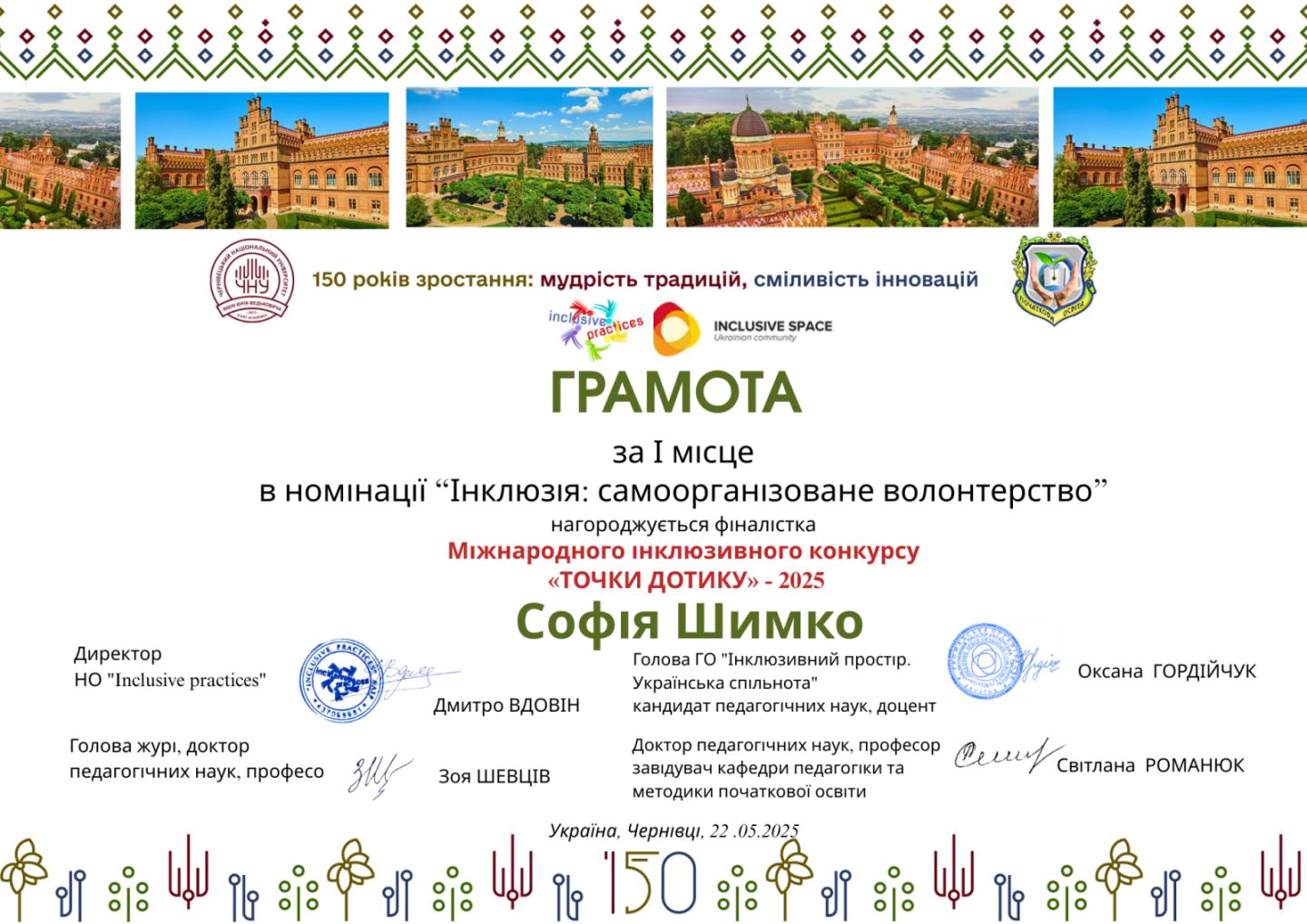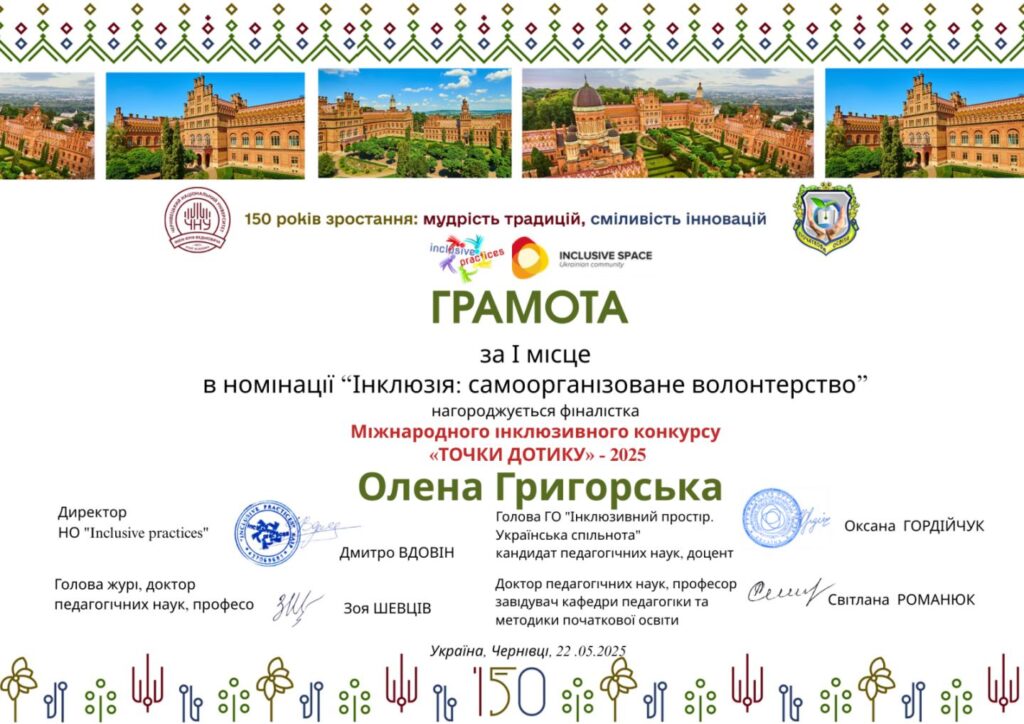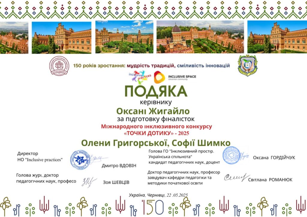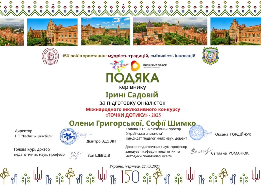 The organizer of the scientific competition is the Department of Pedagogy and Methodology of Primary Education at Yuriy Fedkovych Chernivtsi National University. The founding partners are the public organization “Inclusive Space. Ukraine Community” (Ukraine, Chernivtsi) and the non-profit organization “Inclusive Practices” (Georgia, Ureki) with the support of the International Association for Community Development (IACD) – a global international network accredited by the UN. The author of the idea of “touching points” is Oksana Hordiychuk, an expert of the International Program for the Development of Inclusive Communities (Ukraine, Chernivtsi).