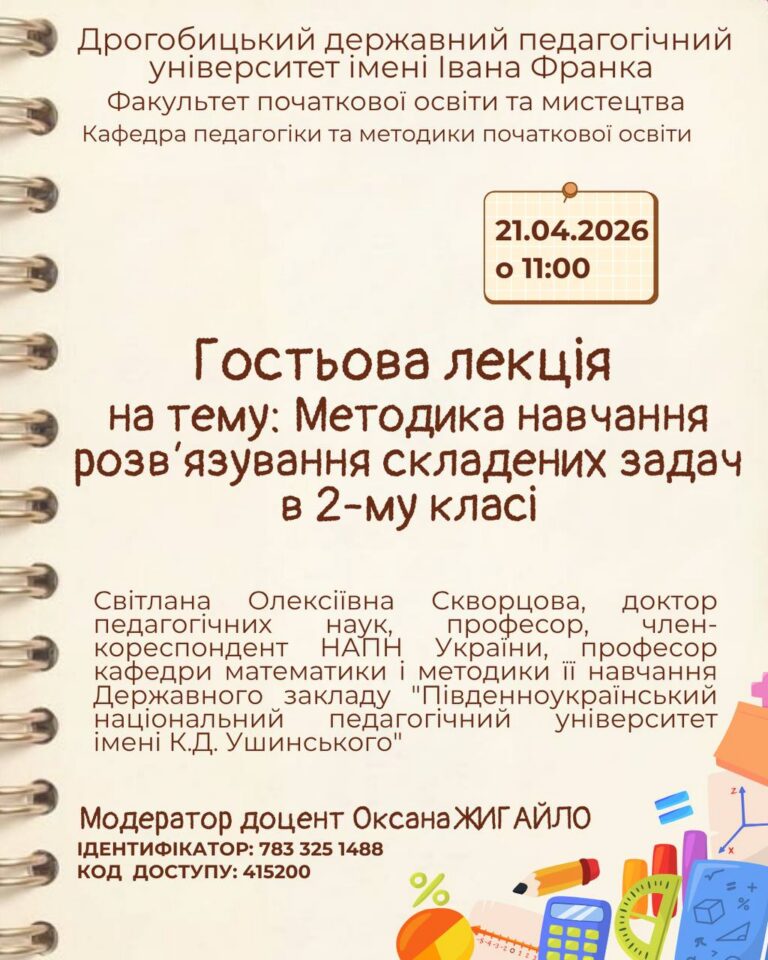 Новини Гостьова лекція професора, доктора педагогічних наук, члена-кореспондента НАПН України, професора кафедри математики і методики її навчання Державного закладу «Південноукраїнський національний педагогічний університет імені К.Д. Ушинського» Світлани СКВОРЦОВОЇ Детальніше 24.04.2026