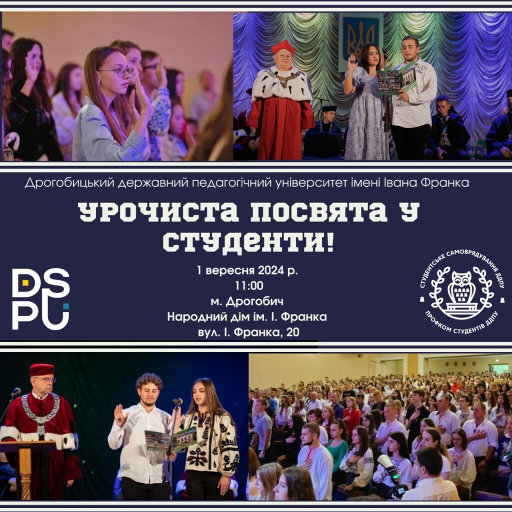 Запрошуємо першокурсників на Урочисту посвяту у студенти Дрогобицького державного педагогічного університету імені Івана Франка. Захід відбудеться 1 вересня 2024 року об 11:00 год. у Народному домі ім. І.Франка (вул. Івана Франка, 20).