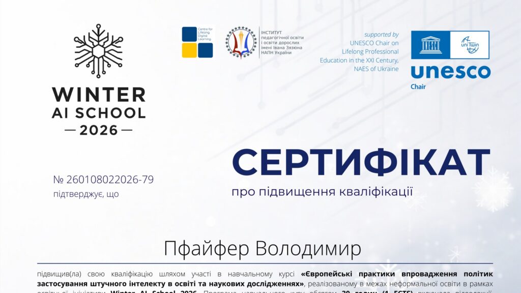 Впродовж 26 січня – 8 лютого тривав навчальний курс «Європейські практики впровадження політик застосування штучного інтелекту в освіті та наукових дослідженнях», що відбувсяу межах освітнього проєкту «Winter AI School 2026». Організатором заходу виступила Кафедра ЮНЕСКО «Неперервна професійна освіта ХХІ століття» НАПН України разом із Centre for Lifelong Digital Learning. Співорганізатором виступив Інститут педагогічної освіти і освіти дорослих імені Івана Зязюна НАПН України в особі відділу зарубіжних систем педагогічної освіти і освіти дорослих, відділу андрагогіки та відділу змісту і технологій педагогічної освіти. Слухачами курсу стали аспіранти кафедри загальної педагогіки та дошкільної освіти Дрогобицького державного педагогічного університету імені Івана Франка.