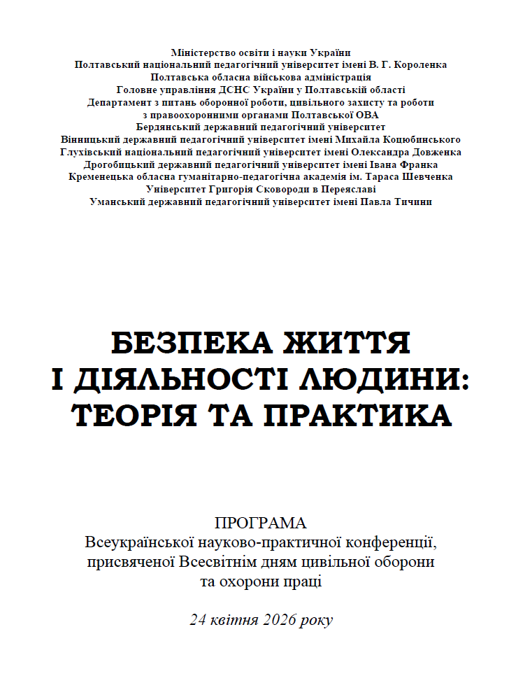 24 квітня 2026 року викладачі кафедри технологічної та професійної освіти Дрогобицького державного педагогічного університету імені Івана Франка взяли активну участь у роботі Всеукраїнської науково-практичної конференції «Безпека життя і діяльності людини: теорія та практика», присвяченої Всесвітнім дням цивільної оборони та охорони праці, що відбулася на базі Полтавського національного педагогічного університету імені В.Г. Короленка за участі провідних закладів вищої освіти України. Співорганізатором наукового форуму виступив і Дрогобицький державний педагогічний університет імені Івана Франка, що засвідчує активну роль університету у формуванні сучасного безпекового освітнього дискурсу.