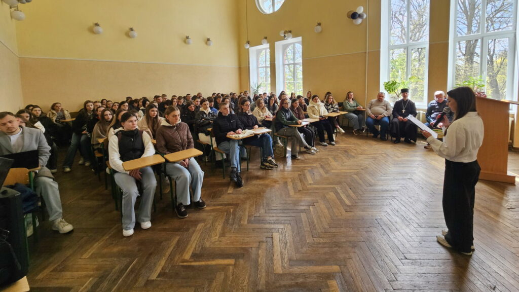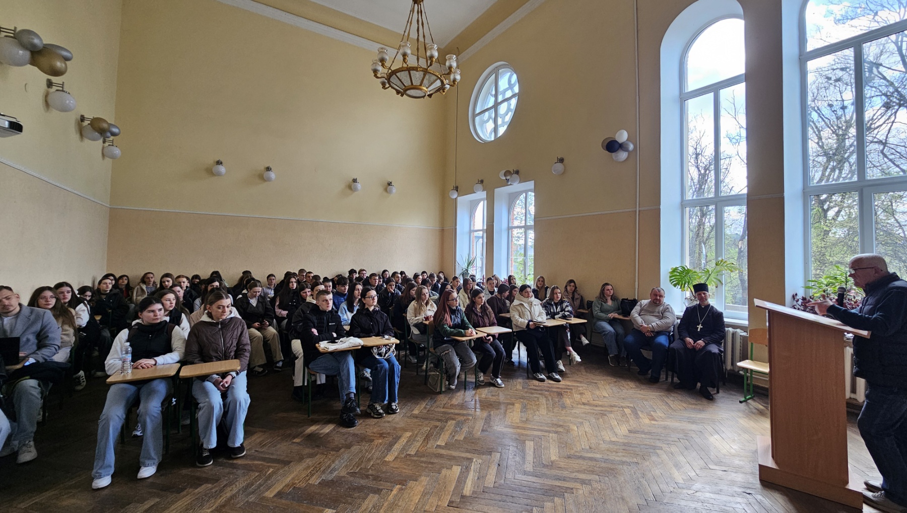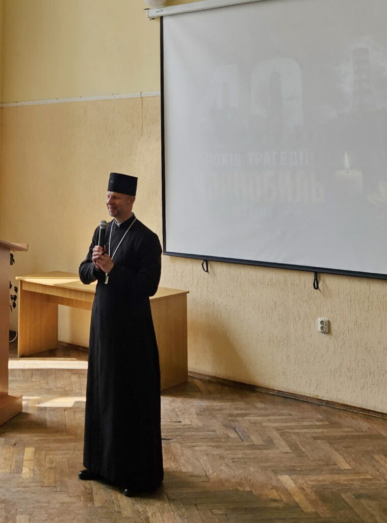 Розпочався захід зі спільної молитви, яку провів університетський капелан о. Олег Кекош. У своїй духовній настанові він наголосив на важливості пам’яті, єдності та відповідальності перед майбутніми поколіннями, зберігати правду про трагедію та вшановувати тих, хто віддав життя, рятуючи інших.