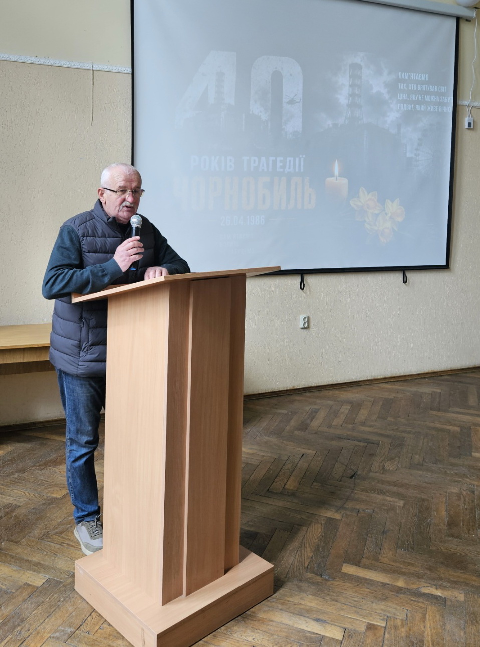 Особливим моментом зустрічі став виступ Михайла Губіцького – фахівця служби охорони праці університету, учасника ліквідації наслідків аварії на Чорнобильській атомній електростанції. Він поділився власними спогадами про події 1986 року, розповів про складні умови роботи, небезпеки, з якими довелося зіткнутися ліквідаторам, а також про ціну, яку заплатили тисячі людей за подолання наслідків катастрофи.
