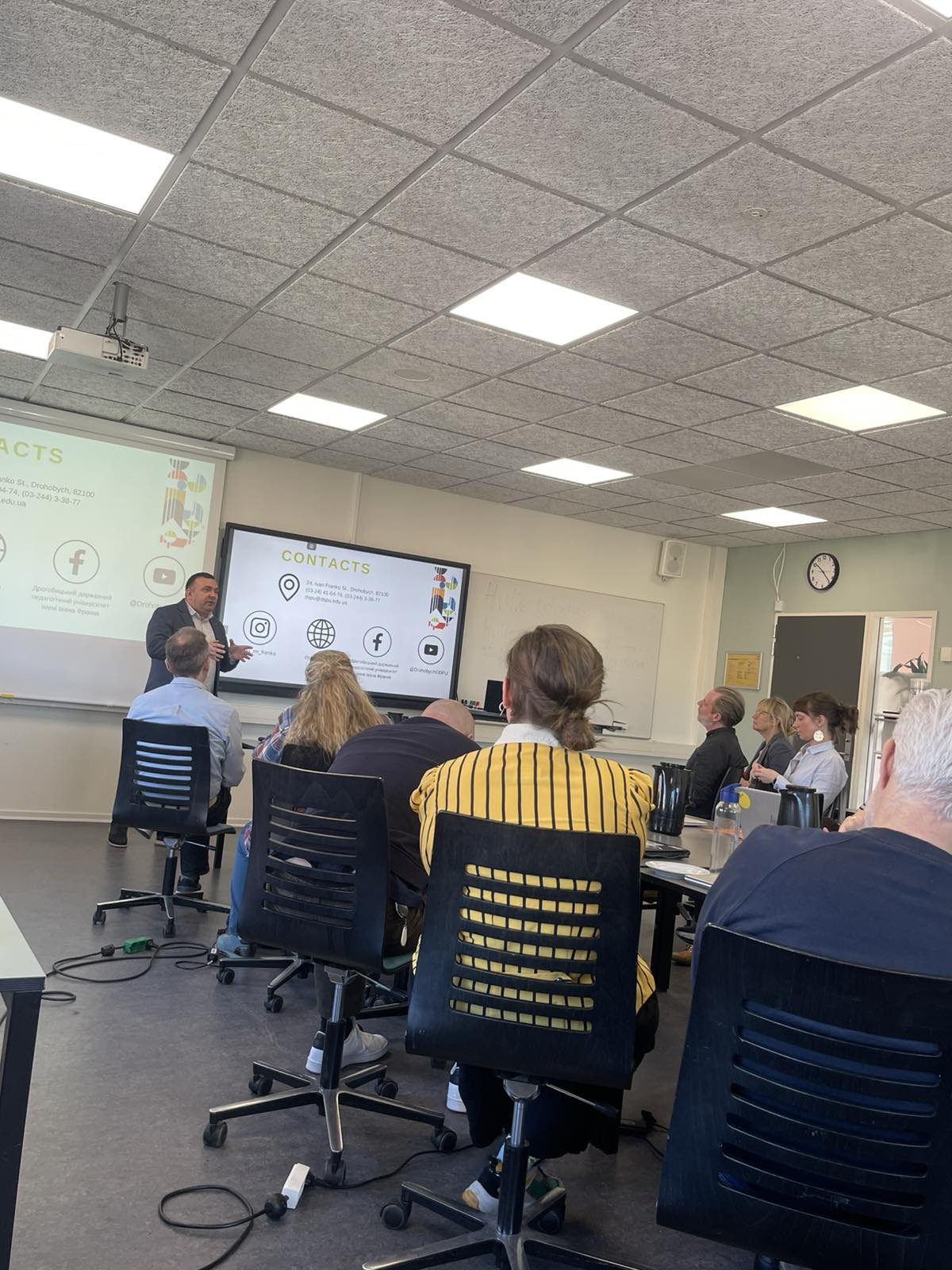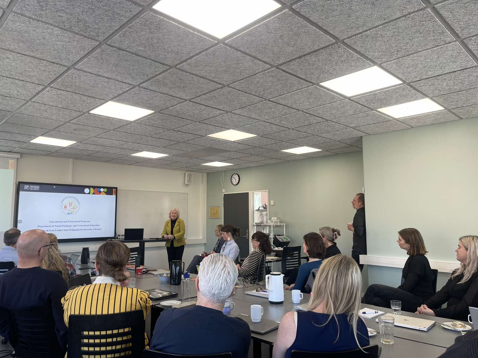 Учасники заходу також ознайомилися з матеріально-технічною базою партнерського вишу, провели зустрічі з представниками відділу міжнародних зв’язків, відвідали заклади соціального обслуговування та освітні установи, які є базами практики Університетського коледжу ВІА. Упродовж перебування в данському університеті представники делегації ДДПУ взяли участь у низці зустрічей з керівництвом та науково-педагогічним складом кафедри соціальної педагогіки партнерського університету, де обговорили актуальні питання підготовки соціальних педагогів в обох країнах, а також підвели підсумки спільної роботи за попередні роки (адже співпраця між обома ЗВО триває уже декілька років і є досить результативною). Делегація Дрогобицького університету висловлює вдячність доктору Флеммінгу Остербі Арнфреду, координатору програми з соціальної педагогіки, за можливість участі у заході, цікаву, змістовну програму та знайомство з історією і культурою Данії.
