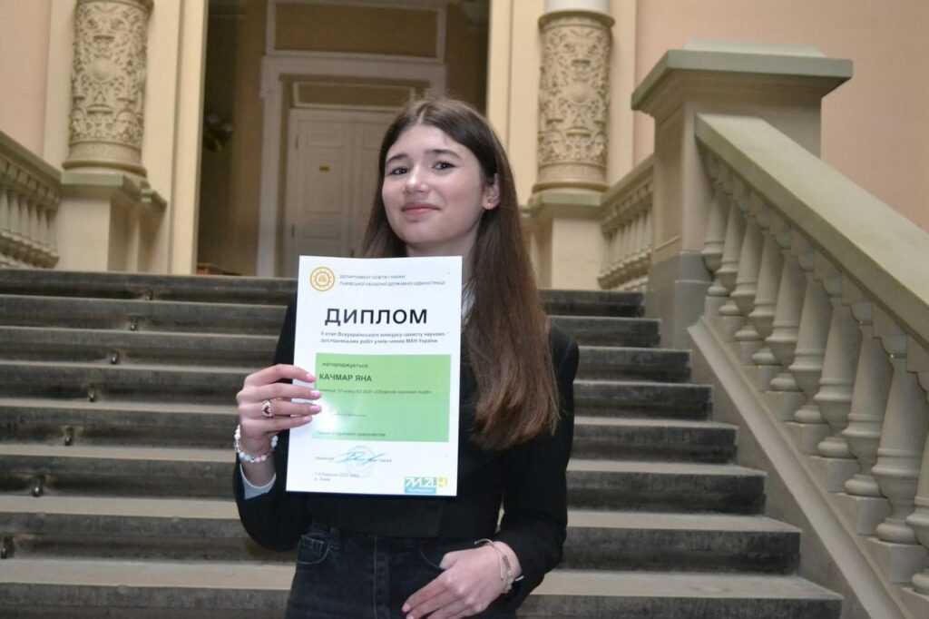 Учениця КЗ ЛОР «Обласний науковий ліцей» Яна Качмар виборола ІІІ місце у секції «Історичне краєзнавство» з науковою роботою на тему «Українська греко-католицька церква на Дрогобиччині (1944-1953 рр.). Наукові керівники – доктор історичних наук, професор, завідувач кафедри історії України Дрогобицького педагогічного університету Василь Ільницький та вчитель історії КЗ ЛОР «Обласний науковий ліцей» Оксана Петренко.