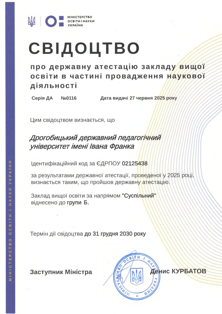 Проходження атестації за трьома науковими напрямами свідчить про упевнене зростання  вишу,  високу якість наукових досліджень, підтверджуючи статус Дрогобицького університету як потужного освітнього та наукового центру. Вітаємо академічну спільноту Франкового вишу із достойними та успішними результатами державної атестації та висловлюємо вдячність за злагоджену роботу попри складні виклики  сьогодення