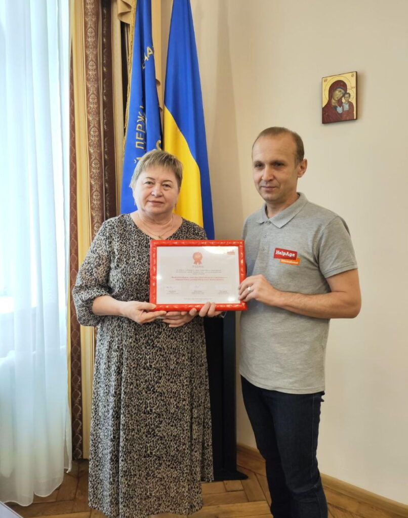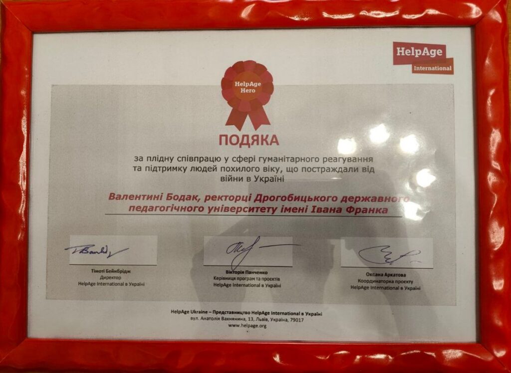 Також ректору Валентині Бодак було вручено подяку від партнерства HelpAge International в Україні за плідну співпрацю у сфері гуманітарного реагування та підтримку людей похилого віку, які постраждали від війни в Україні.