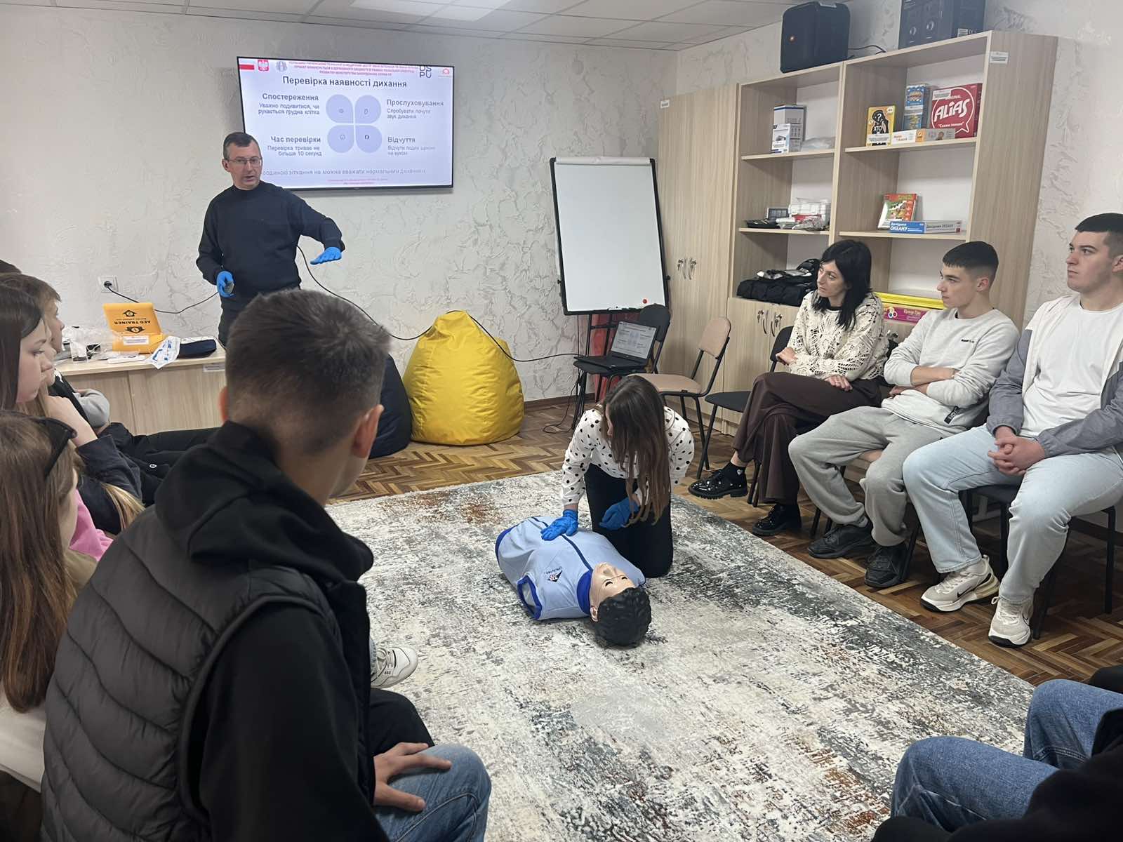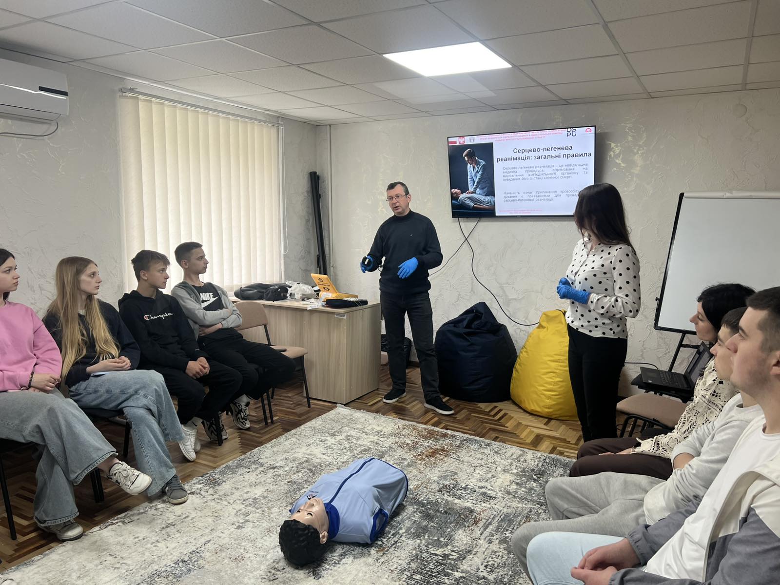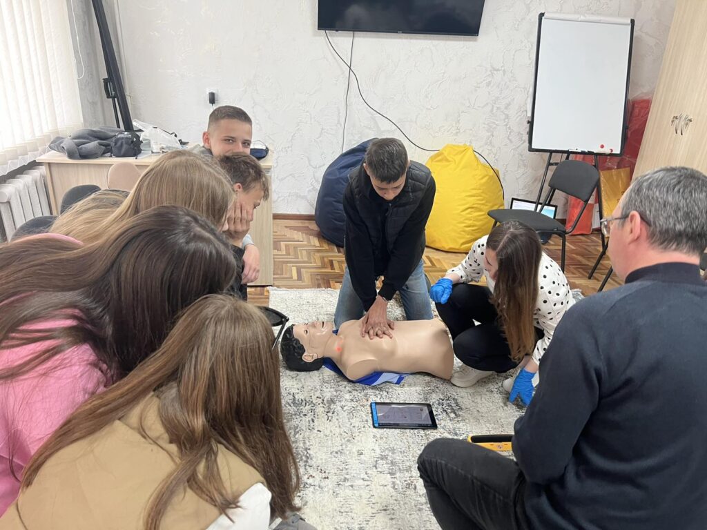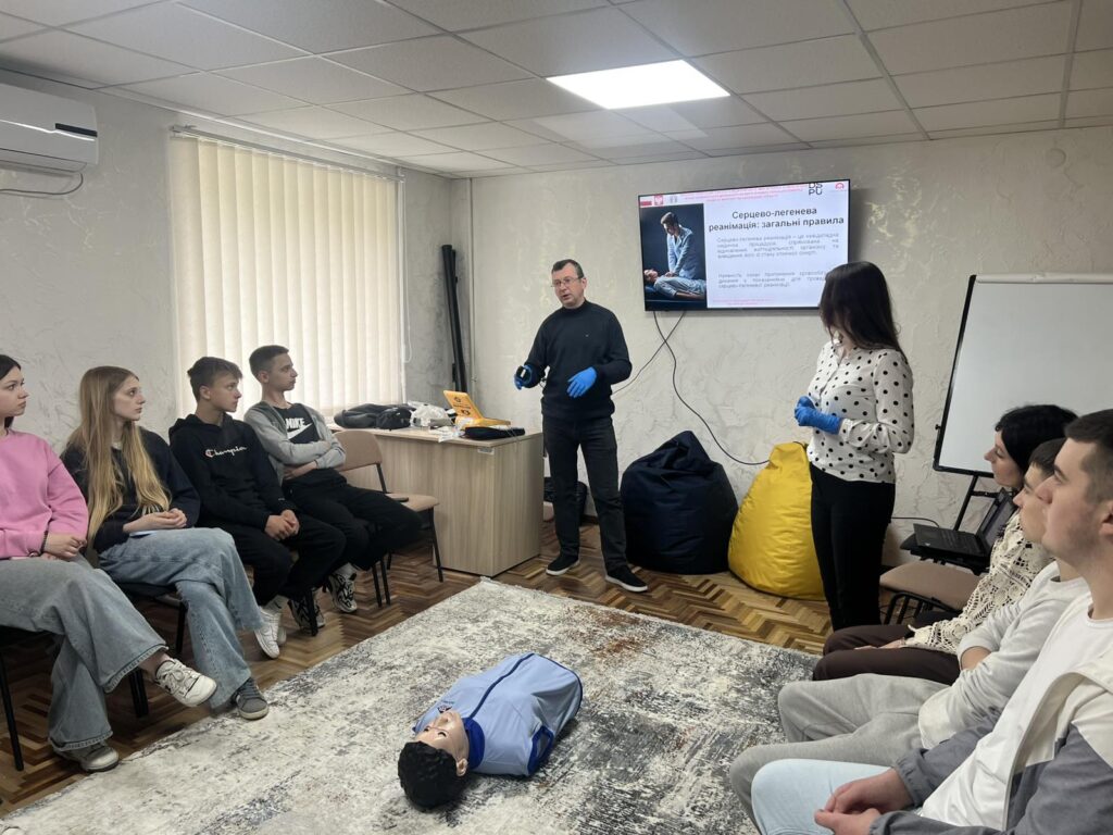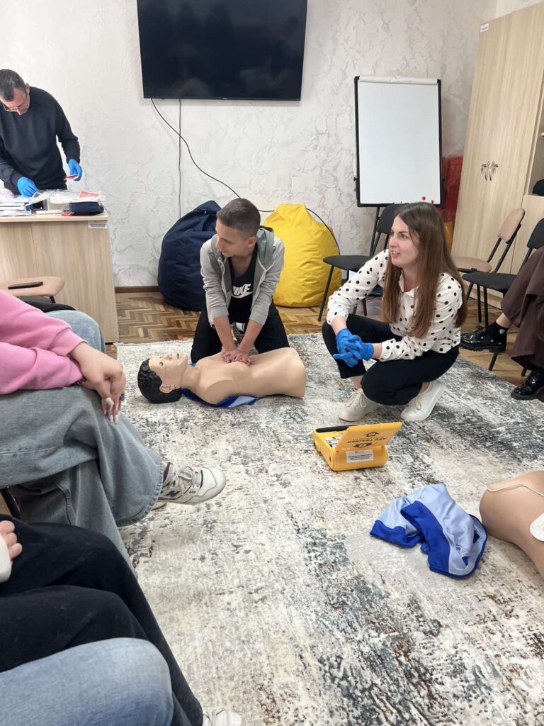 Третій блок – навчання з надання першої долікарської допомоги – реалізують викладачі факультету здоров’я людини і природничих наук: доктор біологічних наук, доцент, завідувач кафедри медико-біологічних наук, географії та екології Віталій Філь та викладачка цієї ж кафедри Катерина Фещак. Навчання організовано для чотирьох груп (по 10–15 осіб), до яких увійшли вчителі та учні шкіл міста. Загалом курс проходять 52 учасники. Заняття тривають з 6 по 27 травня, охоплюючи 14 зустрічей і 35 навчальних годин.