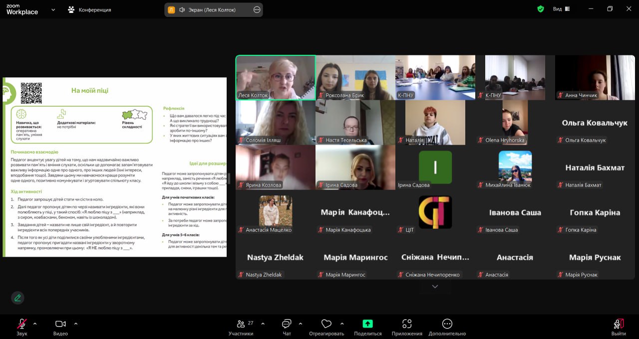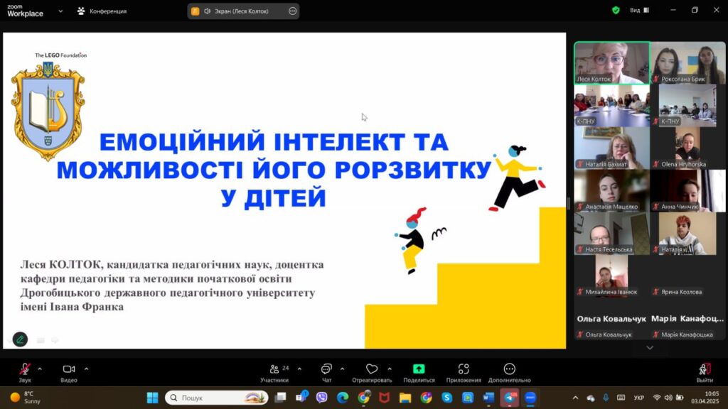 Створена на початку лекції позитивна атмосфера спілкування, весняні компліменти, яскраві емоції дозволили провести міжвузівську зустріч на позитиві, ресурсно та незабутньо. Лекторка акцентувала увагу на важливості формування соціально-емоційного інтелекту у дітей, як важливої складової розвитку особистості, аналізувала основні сфери СЕН, та навички які вони формують. Акцентувалася увага на програмах соціально-емоційного навчання PeppyPals «Веселі друзі», та програмі СЕН «Зерна», що сприяють ефективному формуванню соціально-емоційних навичок у дошкільнят та дітей молодшого шкільного віку.