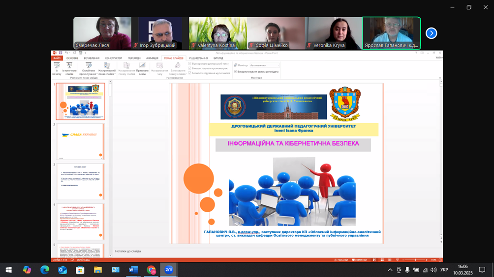 На факультеті історії, педагогіки та психології відбулася гостьова лекція на тему «Інформаційна та кібернетична безпека» для здобувачів першого (бакалаврського) рівня спеціальності 231 «Соціальна робота» (ОПП «Соціальна педагогіка») та другого (магістерського) рівня спеціальності 011 «Освітні, педагогічні науки» (ОПП «Інклюзивна освіта»). Запрошеним лектором виступив Ярослав Гапанович – кандидат наук з державного управління, старший викладач кафедри освітнього менеджменту та публічного управління Південноукраїнського національного педагогічного університету імені К.Д. Ушинського.