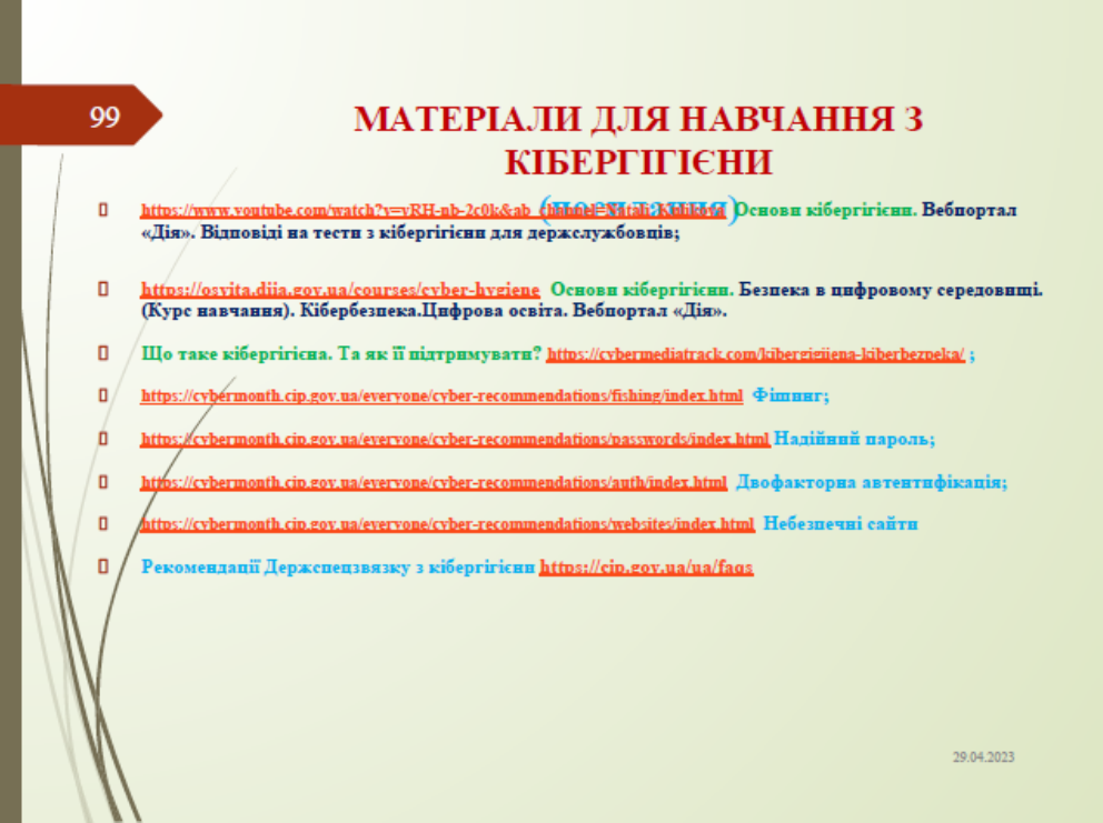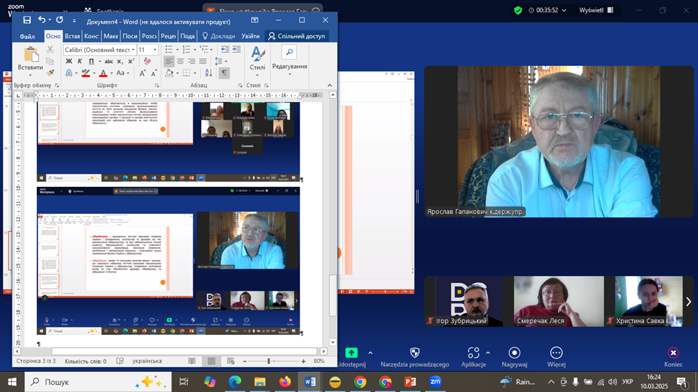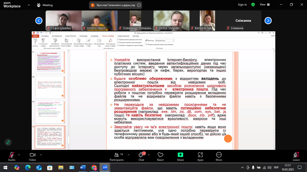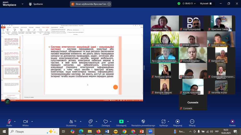 Під час лекції учасники обговорили ключові питання кібербезпеки та захисту інформації в Україні, критерії оцінки захищеності інформації в комп’ютерних системах від несанкціонованого доступу, основні загрози та ризики у кіберпросторі та шляхи їх подолання. Також розглянули вимоги кіберзахисту під час обміну електронними документами та проаналізували аспекти кібергігієни фахівців соціономічних професій.