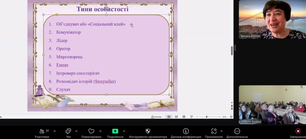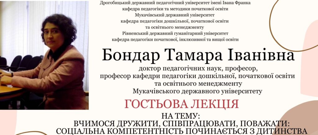 Гостьову лекцію «Вчимося дружити, співпрацювати, поважати: соціальна компетентність починається з дитинства» проведено для здобувачів вищої освіти спеціальності «Початкова освіта» за ініціативи професорки Ірини Садової та доцентки Наталії Калити. Лекторка – Тамара Бондар, докторка педагогічних наук, професорка кафедри педагогіки дошкільної, початкової освіти та освітнього менеджменту Мукачівського державного університету.