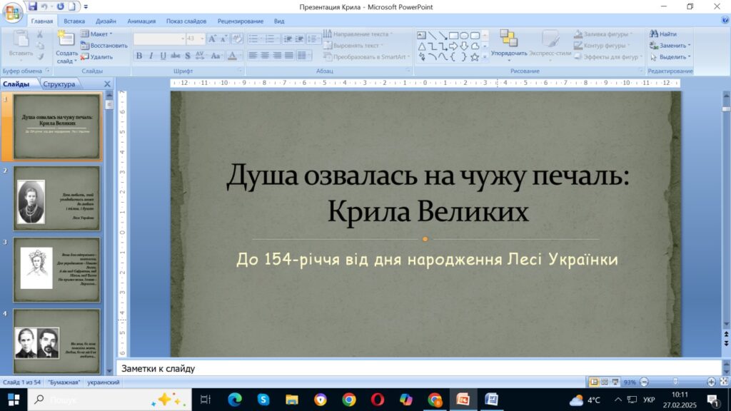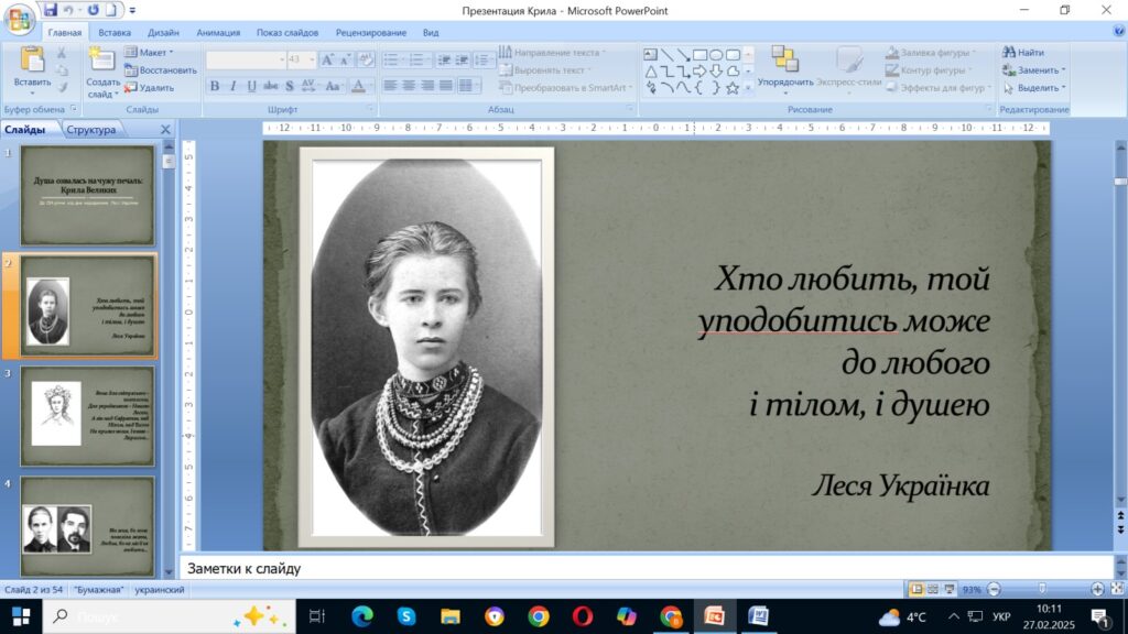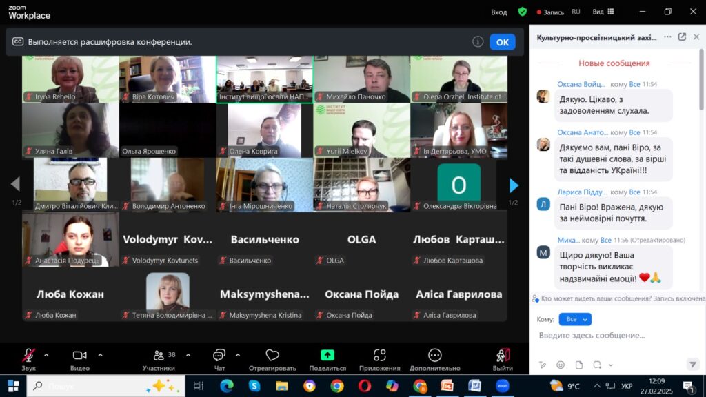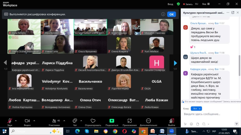 27 лютого у рамках виконання Угоди про співпрацю між Інститутом вищої освіти Національної академії педагогічних наук України та Дрогобицьким державним педагогічним університетом імені Івана Франка докторка філологічних наук, професорка, завідувачка кафедри української мови Віра Котович прочитала лекцію-посвяту «Душа озвалась на чужу печаль: крила Великих (до 154-річчя від дня народження Лесі Українки)».