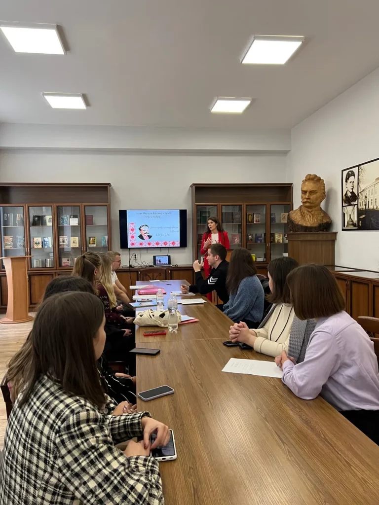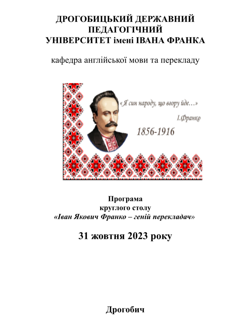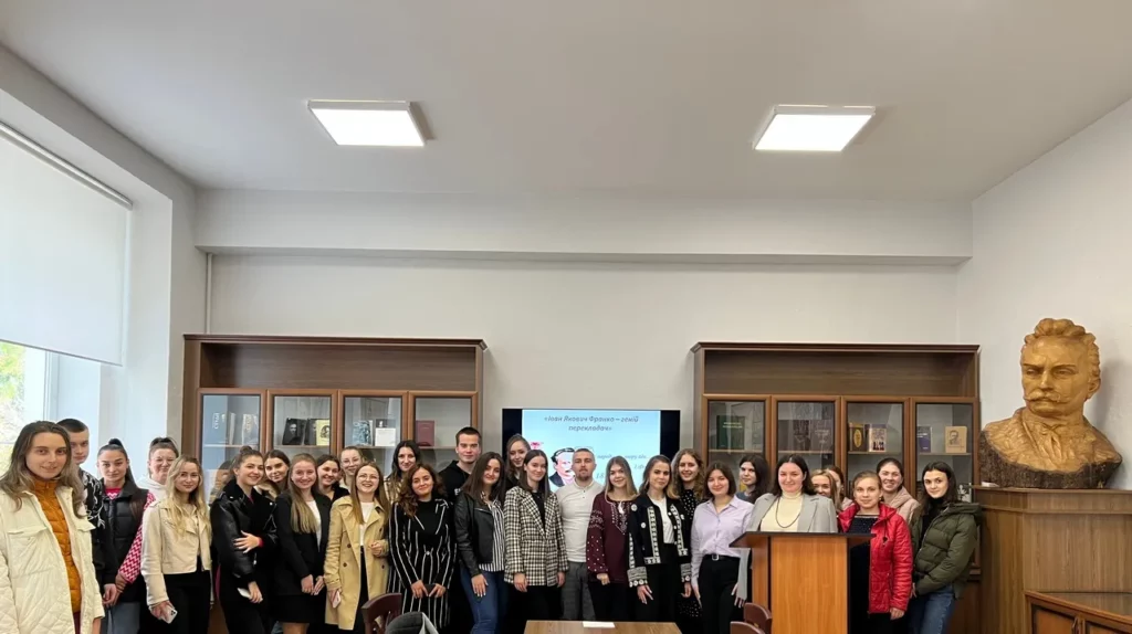 2 листопада на факультеті української та іноземної філології відбувся круглий стіл присвячений перекладам Івана Франка. Організатор заходу – Талалай Юлія Олегівна, завідувач кафедри англійської мови та перекладу, привітала студентів першого (бакалаврського) рівня вищої освіти та другого (магістерського) рівня вищої освіти та виголосила промову: «Іван Франко – засновник класичного українського перекладу».