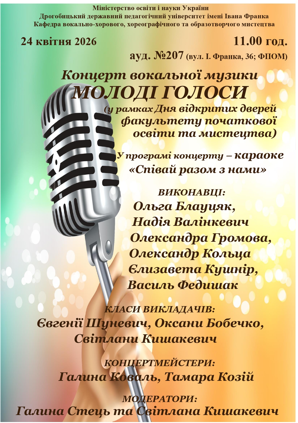 У межах Дня відкритих дверей факультету початкової освіти та мистецтва 24 квітня відбувся концерт вокальної музики «Молоді голоси», на якому кращі студенти-вокалісти, лауреати міжнародних та всеукраїнських конкурсів продемонстрували свої співочі таланти. Модераторками заходу були доцентки Світлана Кишакевич та Галина Стець.