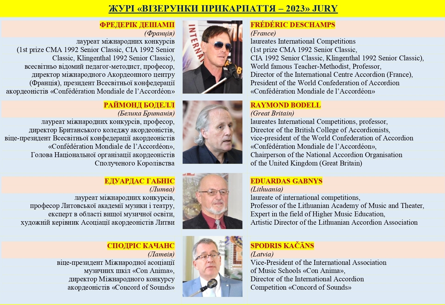 До складу журі увійшли всесвітньовідомі музиканти та педагоги: Фредерік Дешамп (Франція), Раймонд Боделл (Велика Британія), Едуардас Габніс (Литва), Сподріс Качанс (Латвія), Олександо Марінов (Болгарія), Ігор Саєнко (Київ) та Ярослав Олексів (Львів).