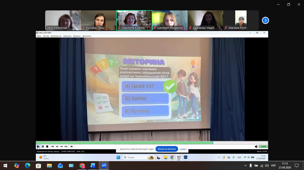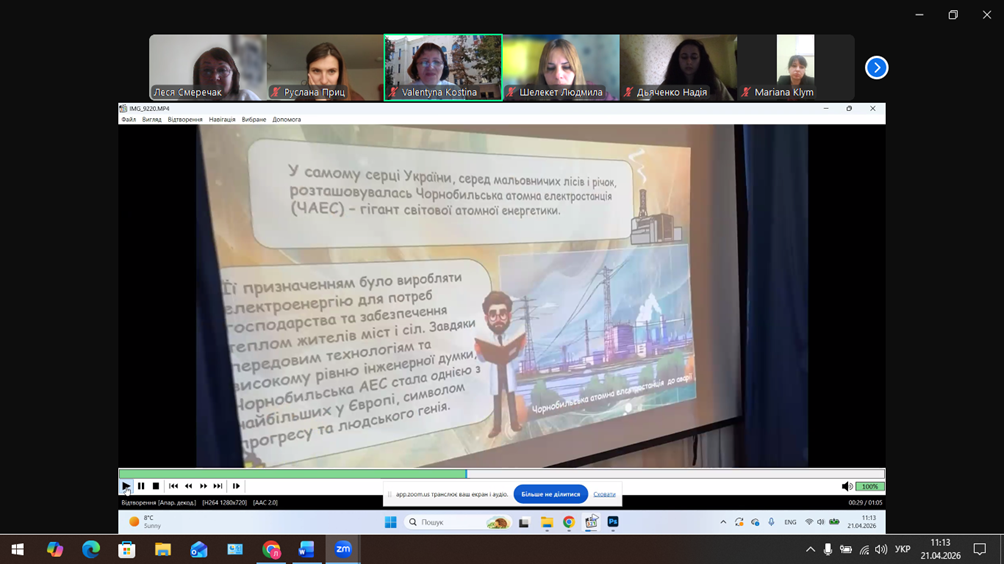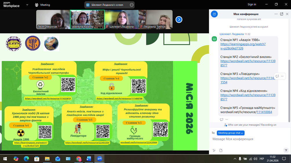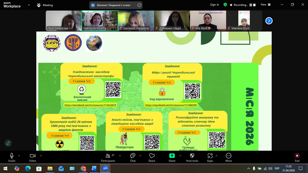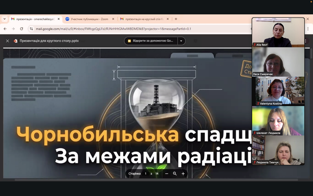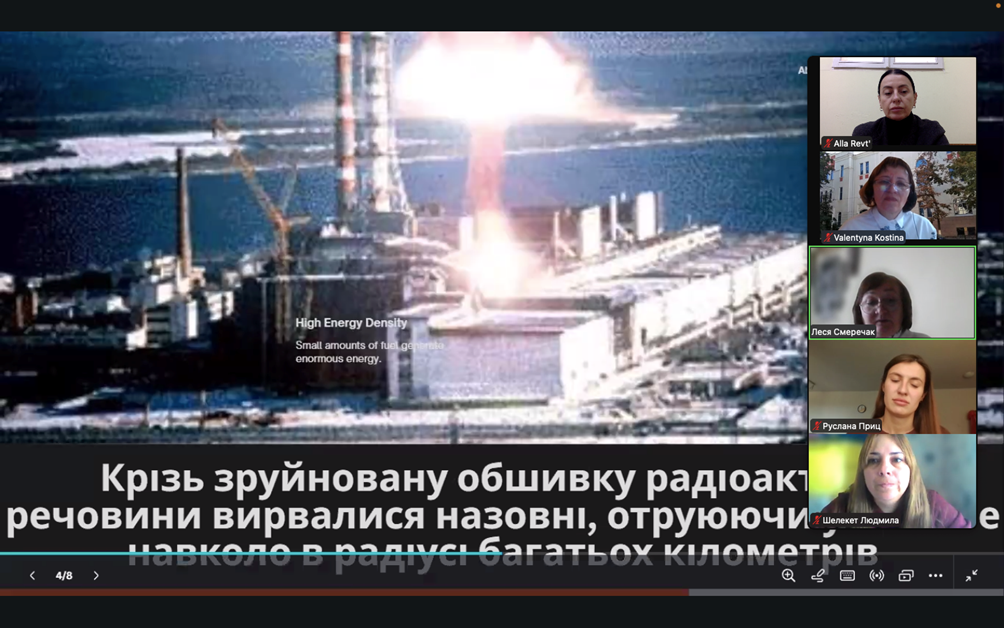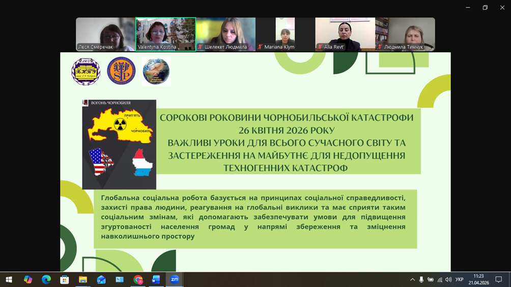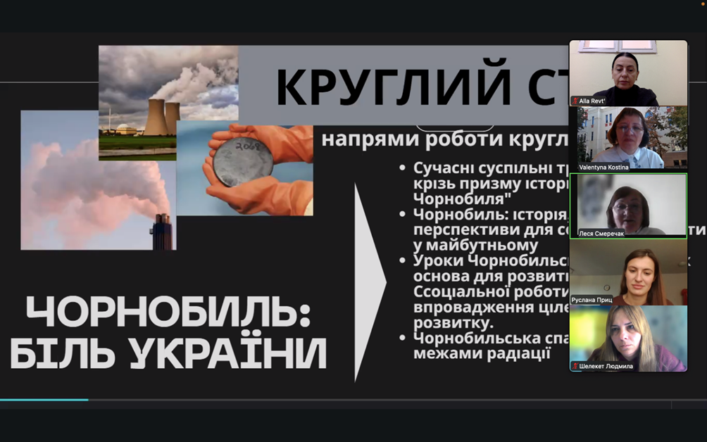 22 квітня відбулося засідання круглого столу на тему: «Чорнобиль: біль України», присвячене вшануванню пам’яті жертв Чорнобильської катастрофи та аналізу її наслідків для сучасного суспільства. Захід об’єднав науково-педагогічних працівників та здобувачів вищої освіти Харківського національного педагогічного університету імені Г.С. Сковороди, Чернівецького національного університету імені Юрія Федьковича, Черкаського державного технологічного університету та Дрогобицького державного педагогічного університету імені Івана Франка. Докторка педагогічних наук, професорка кафедри соціального забезпечення Черкаського державного технологічного університету Світлана Архипова та модераторка заходу доцентка кафедри соціальної педагогіки та корекційної освіти Леся Смеречак презентували доповідь «Чорнобильська спадщина: за межами радіації», зосередивши увагу на глибоких соціальних трансформаціях; Валентина Костіна, докторка педагогічних наук, професорка кафедри соціальної роботи і соціальної педагогіки Харківського національного педагогічного університету імені Г.С. Сковороди, обґрунтувала уроки трагедії як фундамент для розвитку зеленої соціальної роботи на засадах впровадження Цілей сталого розвитку; голова СНТ цього ж університету Інна Новак представила погляди сучасної молоді у доповіді «Чорнобиль: історія, досвід та перспективи для соціальної роботи у майбутньому»; Людмила Тимчук, докторка педагогічних наук, професорка, завідувачка кафедри педагогіки та соціальної роботи Чернівецького національного університету імені Юрія Федьковича, розкрила тему «Чорнобиль як аргумент: роль громадянського суспільства у запобіганні ризикам»; здобувачка першого (бакалаврського) рівня вищої освіти спеціальності «Соціальна робота», членкиня проблемної групи з соціальної педагогіки Дрогобицького державного педагогічного університету імені Івана Франка Мар’яна Андибур проаналізувала катастрофу як вирішальний поштовх до розбудови екологічного та ядерного законодавства; фахівчиня навчально-реабілітаційного центру «Мрія» (м. Львів) Руслана Приц із виступом «Чорнобиль: історія, яку варто знати» наголосила на важливості просвітницької діяльності та практичних аспектах реабілітаційної допомоги дітям з ООП.