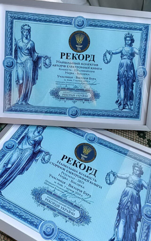 Наймасштабніший літературний рекорд зафіксовано 7 червня 2024 року. 228 літераторів спільними зусиллями створили книгу «Босорка» на 2833 сторінки. Серед жанрів – жахи, містика, сатира, гумор, фентезі та багато інших. Один із розділів написала Вікторія.