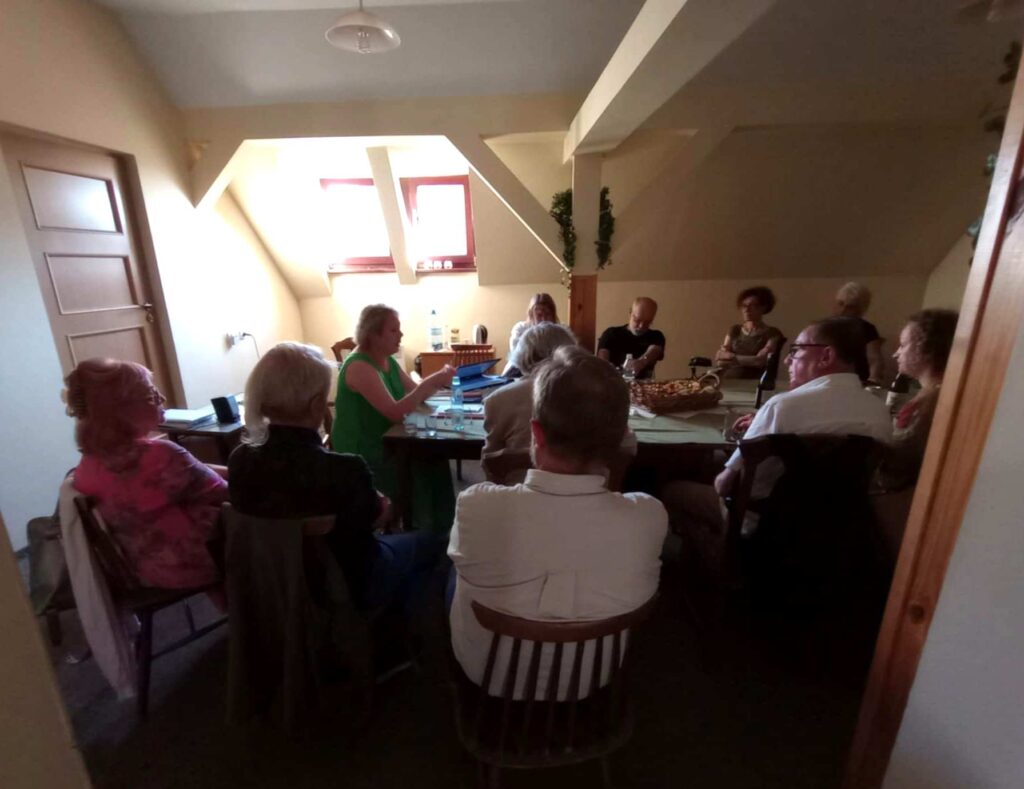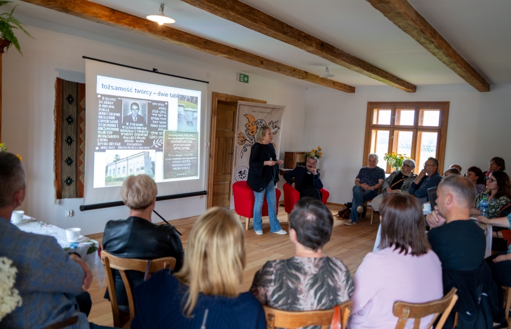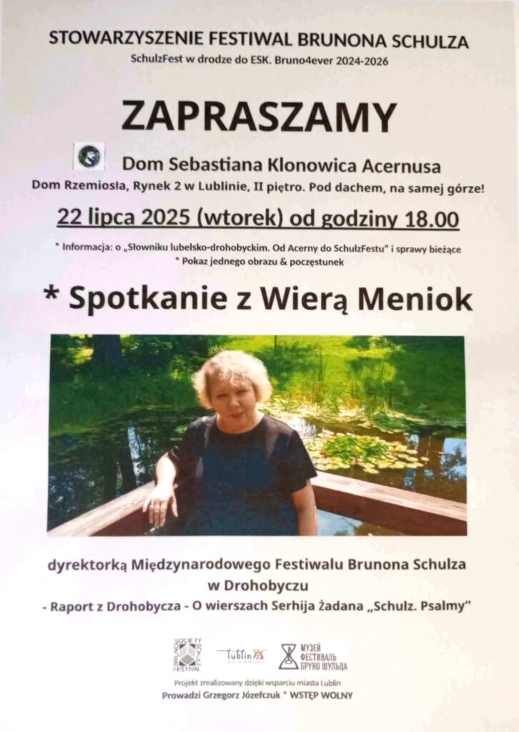 Другою подією, що демонструвала підсумки й водночас накреслювала перспективи партнерства Полоністичного центру та Товариства Фестиваль Бруно Шульца, стала зустріч з членами Товариства й іншими зацікавленими особами, яка відбулася 22 липня й була присвячена творам Сергія Жадана, що пов’язані із Дрогобичем та Шульцом. Розповідь-лекція Віри Меньок, якій передувала передмова Ґжеґожа Юзефчука про багатолітню співпрацю Любліна та Дрогобича, мала назву «Рапорт з Дрогобича – про вірші Сергія Жадана „Шульц. Псалми”» й ґрунтувалась на дрогобицько-шульцівських есеях українського поета, що він їх виголосив під час інавґурацій ШульцФесту та які ще невідомі українському читачеві, а також циклі його віршів «Шульц. Псалми», що увійшов до його найновішої збірки «Скрипниківка» (Meridian Czernowitz 2023; польське видання у перекладі Богдана Задури: Biuro Literackie 2025).