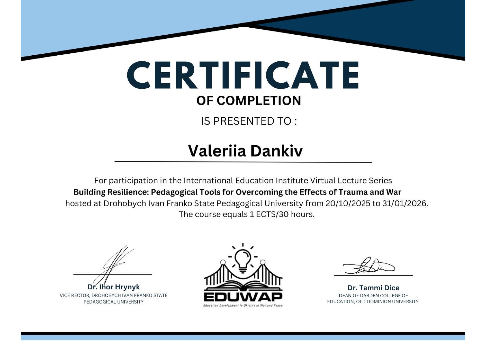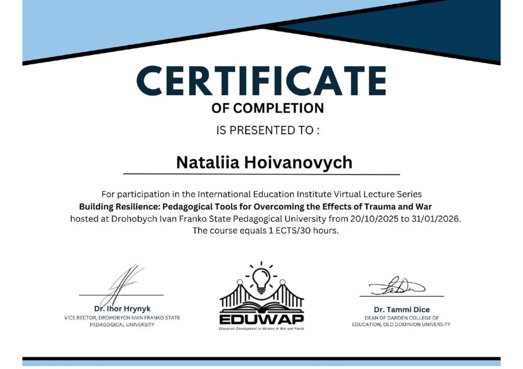 За підсумками міжнародного стажування здобувачі Євгенія Жгута (ФК-2428Б), Анастасія Патен (ФТЕ-2327Б1), Леся Мориконь (ФК-2327Б), Валерія Даньків (ЕТ-2327Б), Максим Орляк (ФК-2526М), доцент кафедри теорії та методики фізичного виховання і спорту Роман Проць та доцент кафедри біології та хімії Наталія Гойванович отримали відповідні сертифікати від Dr. Tammi Dice (Dean of Darden College of Education, Old Dominion University (США).