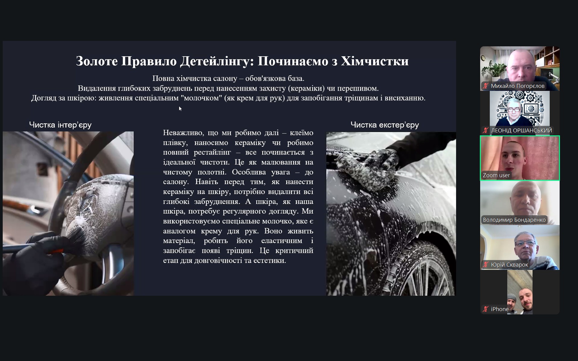 Під час лекції-диспуту було ґрунтовно проаналізовано сучасні технології автомобільного детейлінгу, зокрема етапи професійного очищення, полірування та довготривалого захисту поверхонь транспортних засобів. Окрему увагу приділено характеристикам матеріалів і засобів для захисту лакофарбового покриття, їх експлуатаційним властивостям, екологічності та доцільності використання в навчально-виробничому процесі. Учасники також розглянули інноваційні підходи до стайлінгу автомобілів – від зміни елементів екстер’єру до застосування сучасних плівкових технологій і дизайнерських рішень.
