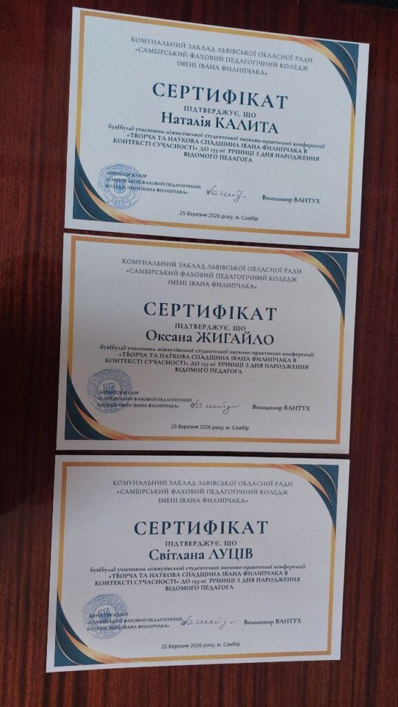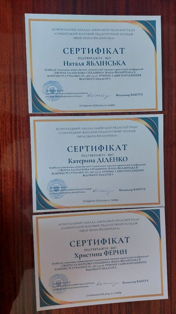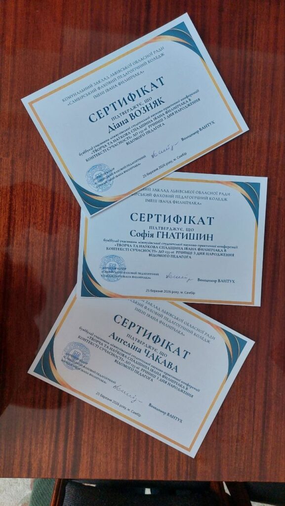 25 березня учасники гуртка «Академічна доброчесність», здобувачі першого (бакалаврського) та другого (магістерського) рівнів вищої освіти, взяли участь у міжвузівській науково-практичній конференції «Творча та наукова спадщина Івана Филипчака в контексті сучасності». Захід відбувся на базі КЗ ЛОР «Самбірський фаховий педагогічний коледж імені Івана Филипчака».