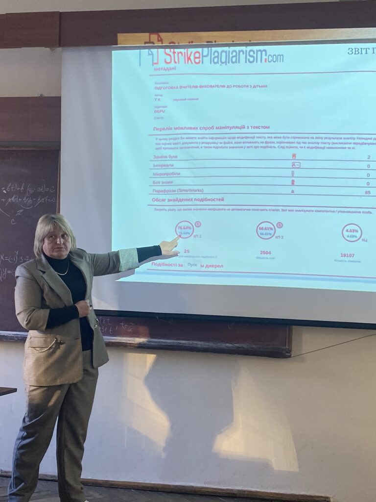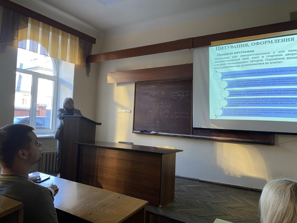 Завідувачка відділу інформаційних технологій та комп’ютерного забезпечення (ІТКЗ) бібліотеки Марія Зварич розповіла, що ж таке «академічна доброчесність» і чому вона така важлива у наш час, які існують конкретні різновиди її порушень та відповідальності за них, ознайомила з елементами аналізу наукових робіт на плагіат, підтвердивши конкретними прикладами перевірку наукових досліджень функціоналом системи StrikePlagiarism.com, наголосила на необхідності правильного оформлення списку використаних джерел, дотримання правил цитування та оформлення покликань на роботи інших авторів.