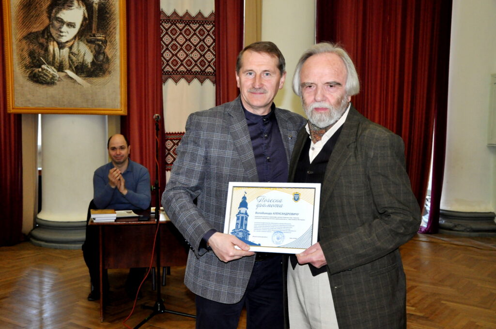 Також відзначила здобутки Володимира Александровича і наукова спільнота Дрогобицького університету: за визначний внесок у розвиток гуманітарних наук, вагомі дослідження історії та культури Дрогобиччини, збереження національної мистецької спадщини професор Леонід Тимошенко від імені ректорату університету та деканату факультету історії, педагогіки та психології привітав ювіляра і вручив грамоту.