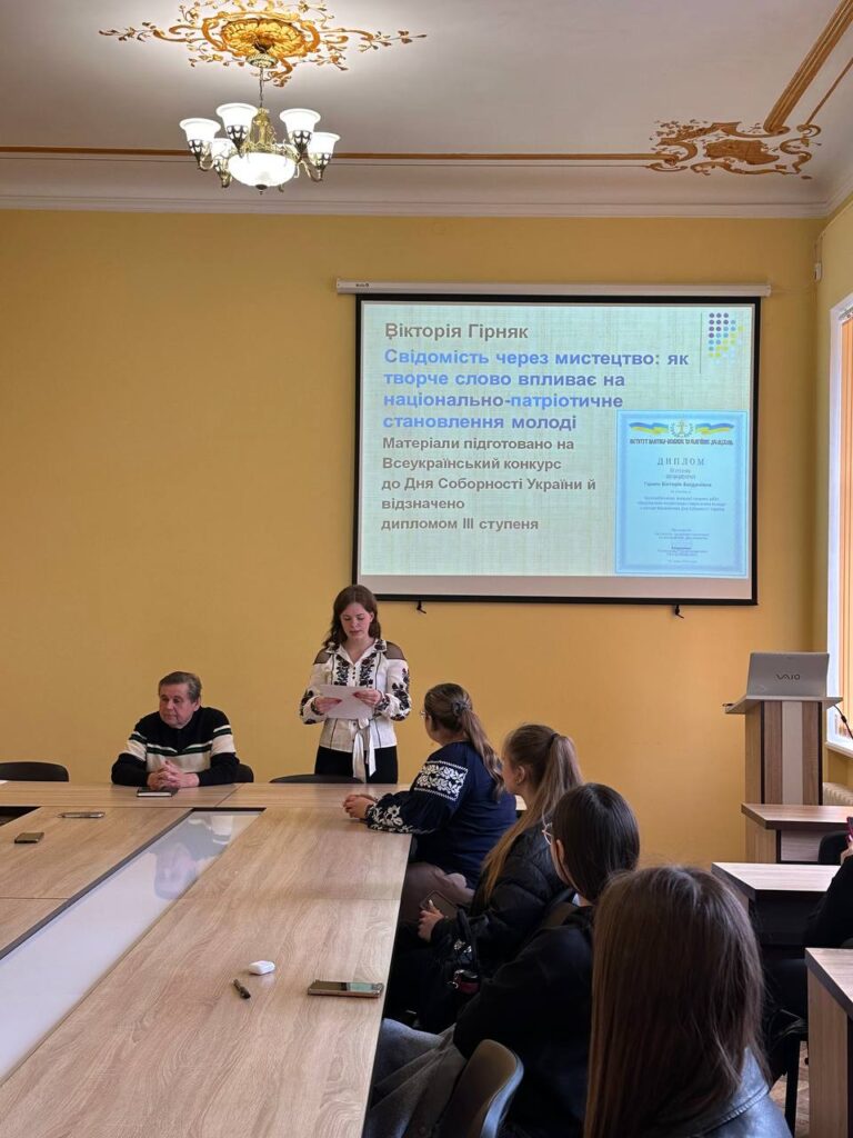 Доповідь «Свідомість через мистецтво: як творче слово впливає на національно-патріотичне становлення молоді» виголосила студентка Вікторія Гірняк. Цей матеріал було підготовлено й подано на Всеукраїнський конкурс до Дня Соборності України й відзначено дипломом ІІІ ступеня. Наголосимо, що патріотизм і національна свідомість – вагомий складник виховного ідеалу Івана Франка. У доповіді наголошено, що «творчість є прикладом того, як слово здатне не лише описувати реальність, але й змінювати її». Професор Володимир Ковальчук привітав Вікторію Гірняк із вагомими науковими досягненнями, які сприяють утвердженню високого авторитету нашого університету.