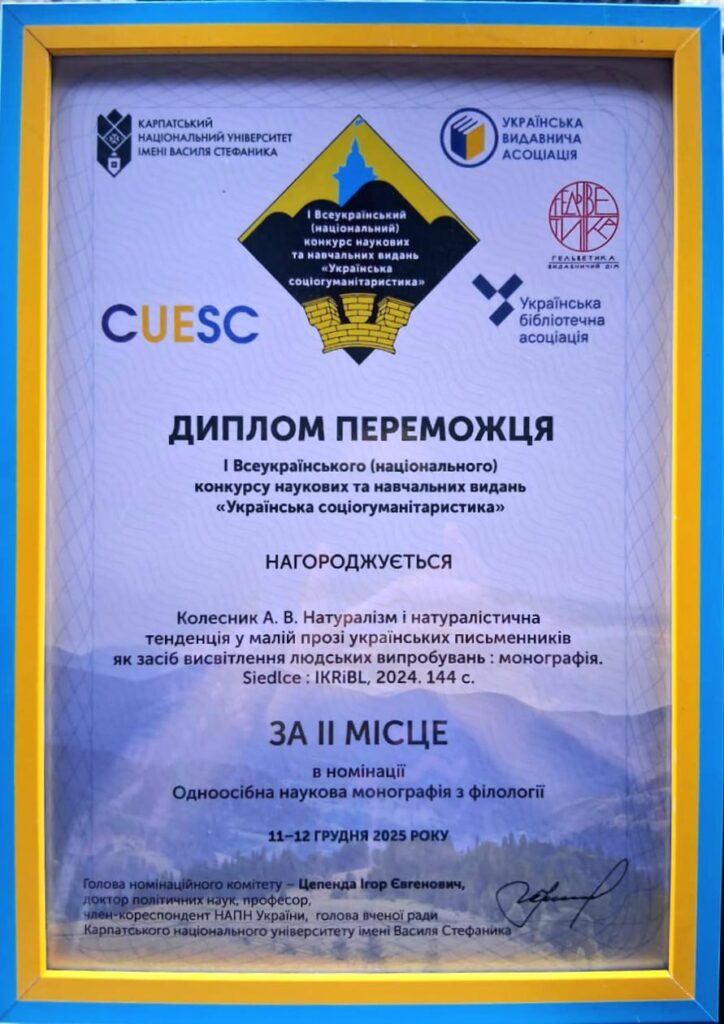 У грудні 2025 р. у стінах Карпатського національного університету імені Василя Стефаника відбулися урочисті церемонії нагородження переможців І Всеукраїнського (національного) конкурсу наукових та навчальних видань «Українська соціогуманітаристика», який започаткували Карпатський національний університет імені Василя Стефаника, Українська видавнича асоціація, Українська бібліотечна асоціація, Видавничий дім «Гельветика» та Центр українсько-європейського наукового співробітництва.Повною мірою були представлені вісім ключових галузей гуманітаристики: політологія, історія та археологія, філософія, соціологія, культурологія, релігієзнавство, філологія та журналістика. У номінації «Одноосібна монографія з філології» друге місце посіла книга Алли Колесник «Натуралізм і натуралістична тенденція у малій прозі українських письменників як засіб висвітлення людських випробувань». Монографія представляє частину дисертаційного дослідження на здобуття наукового ступеня доктора філологічних наук, написаного під керівництвом завідувачки кафедри зарубіжної літератури та полоністики професорки Галини Сабат. Призове місце в конкурсі засвідчує актуальність, методологічну ґрунтовність, науковий потенціал і глибокий інтелектуальний зміст розкритої теми.