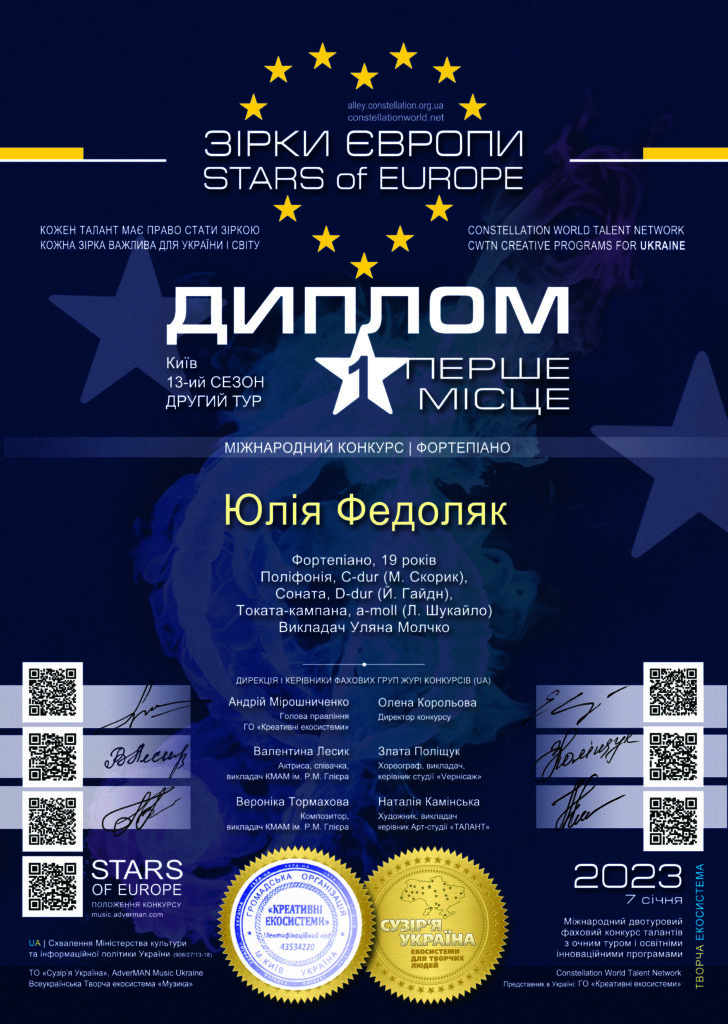 Талановита піаністка представила свою програму на Міжнародному музичному конкурсі «Алея зірок України», який відбувся 7 січня 2023 року в м. Києві. За виконання різностильової програми конкурсне журі присудило Юлії Федоляк І премію.