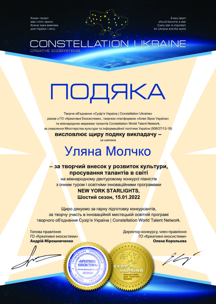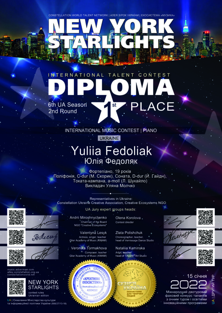 Міжнародний двотуровий конкурс «New York Starlights» приніс Юлії Федоляк ще одне лауреатське звання. На цій мистецькій артімпрезі її професійний ріст під керівництвом доцента Уляни Молчко та індивідуальний музичний талант дали змогу отримати І премію. Піаністичне змагання, що відбулося 15 січня 2023 року в місті Києві стало блискучим ґрунтом для подальших фортепіанних здобутків.