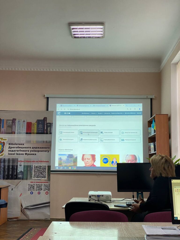 Завідувачка відділу перевірки академічних текстів на плагіат Марія Зварич розповіла студентам про особливості пошуку та опрацювання наукових джерел, про сайт бібліотеки, продемонструвала студентам репозитарій бібліотеки, в якому вони можуть знайти необхідні джерела, а також поінформувала присутніх про бази даних, до яких університет має доступ, зокрема – Scopus та WebofScience. Наголосила на важливості дотримання студентами академічної доброчесності та перевірки студентських наукових робіт на наявність плагіату.