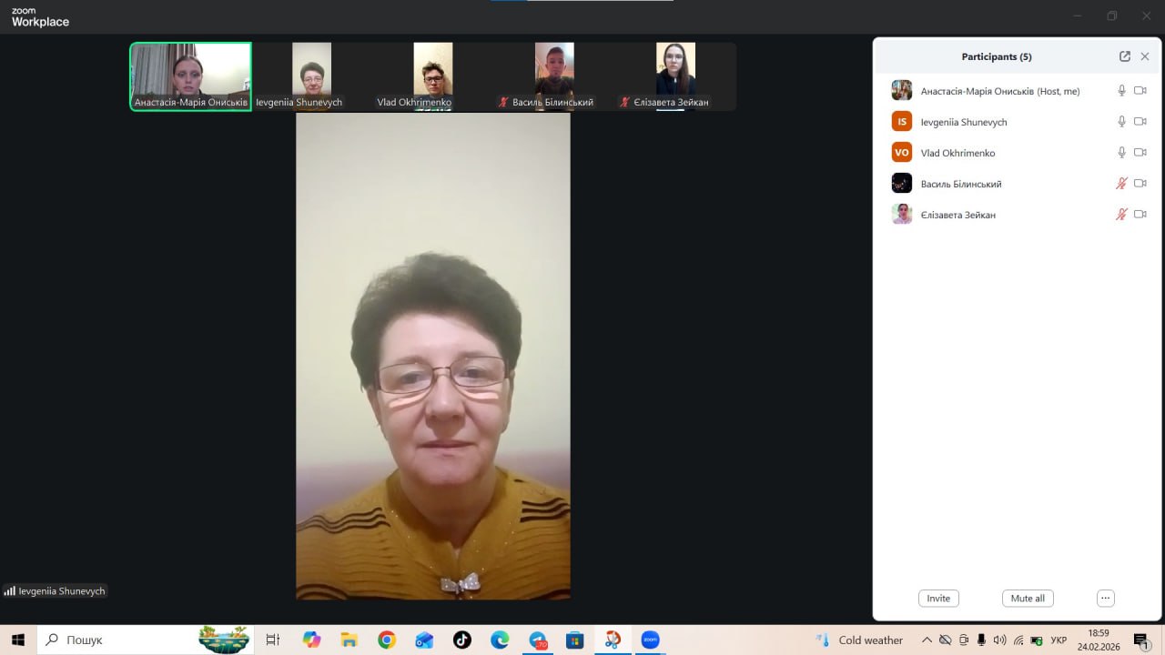 Кураторка виголосила доповідь на тему: «Чотири роки незламності: як війна сформувала нове покоління українців». Євгенія Шуневич акцентувала увагу на тому, що за чотири роки повномасштабної війни українці довели свою стійкість та силу єдності. Вона підкреслила важливість пам’яті про захисників і мирних людей, які віддали життя за свободу України; наголосила на відповідальності молоді навчатися, підтримувати одне одного й робити свій внесок у майбутню Перемогу, адже саме молоде покоління є надією держави та рушійною силою її відбудови. Педагогиня закликала зберігати віру, людяність і впевненість у переможному майбутньому.