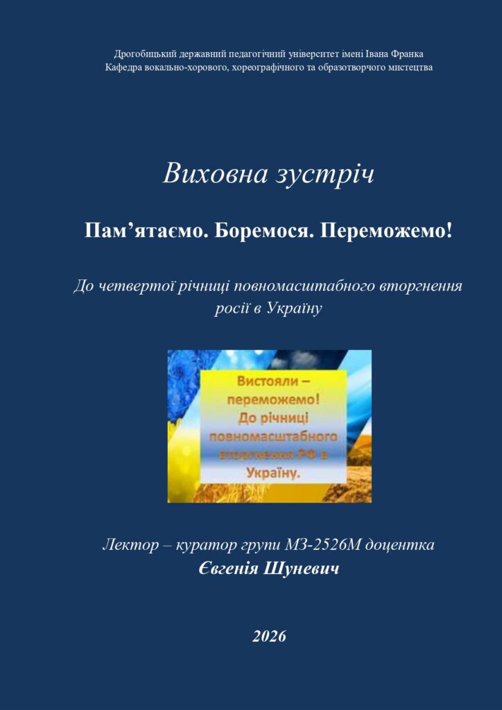24 лютого доцентка кафедри вокально-хорового, хореографічного та образотворчого мистецтва, кураторка групи МЗ-2526М Євгенія Шуневич провела виховну зустріч «Пам’ятаємо. Боремося. Переможемо!». Захід, який проходив в режимі онлайн на платформі zoom, було приурочено четвертій річниці повномасштабного вторгнення росії в Україну.