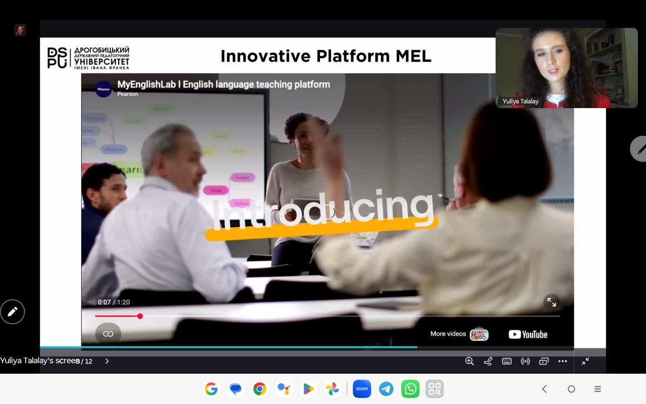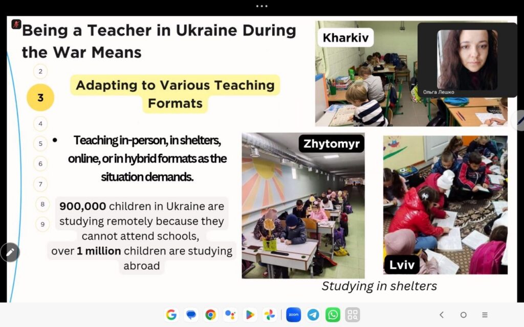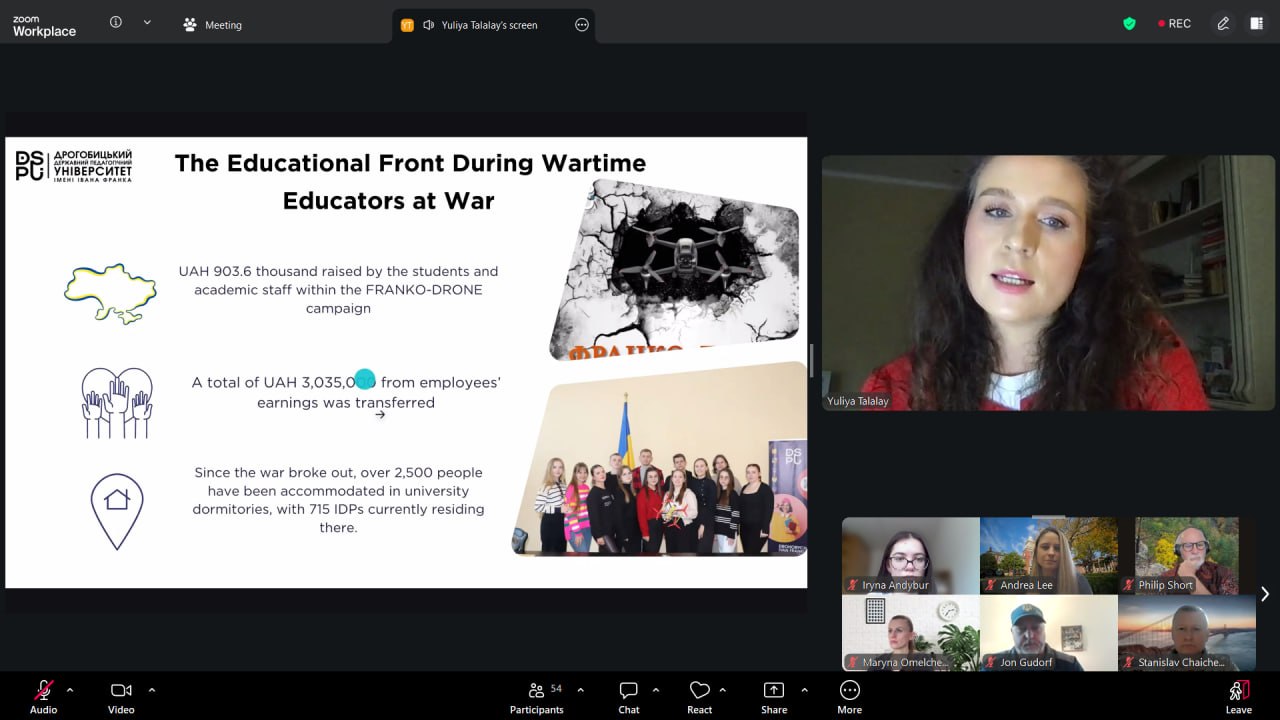 Спікеркою заходу стала Юлія Талалай, завідувачка кафедри англійської мови та перекладу ДДПУ. У своїй доповіді Юлія Талалай представила бачення української освітньої спільноти в умовах війни, поділилася викликами, з якими стикаються викладачі та студенти (психоемоційний стан, рівень мотивації), а також розповіла про адаптацію навчального процесу до сучасних реалій. Ольга Лешко, вчителька трускавецької СЗШ №1, докторка філософії, зосередилась на викликах нестабільного освітнього процесу, з якими стикаються учні та вчителі під час навчання в умовах війни (повітряні тривоги, перебої з електропостачанням тощо).