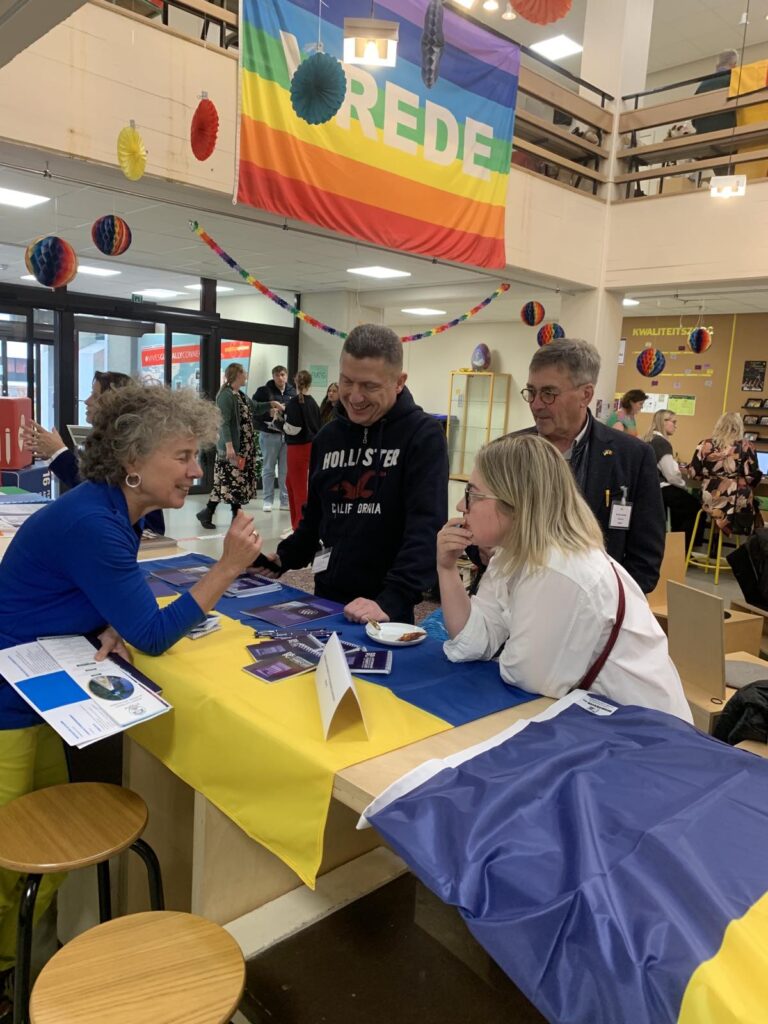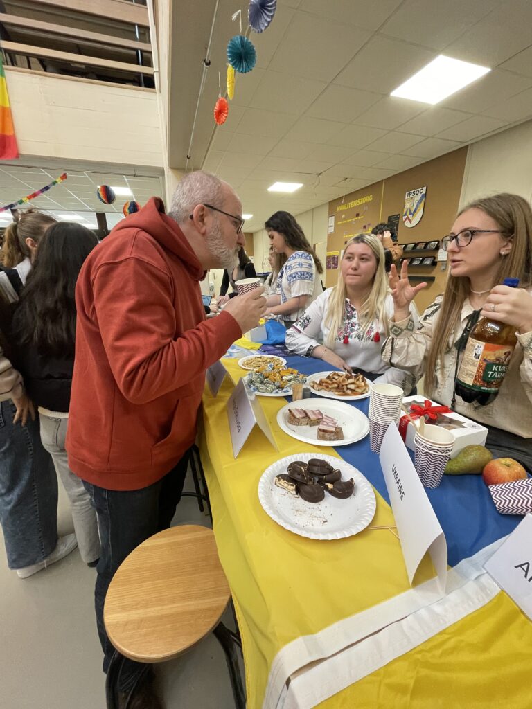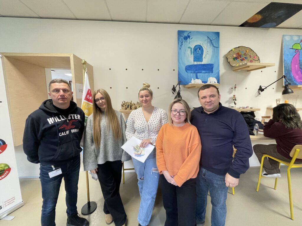 Під час візиту делегація також мала змогу зустрітися зі студентками факультету історії, педагогіки та психології Софією Ксеняк та Анною Оріхівською, які зараз проходять семестрове навчання в рамках програми академічної мобільності Erasmus+. На міжнародному та міжкультурному ярмарку наші студентки ініціювали збір коштів на закупівлю парафіну для виготовлення окопних свічок в межах студентської факультетської ініціативи «Окопна свічка для ЗСУ – твій вогник світла перемоги».