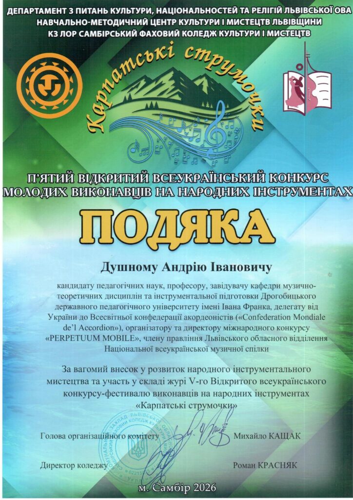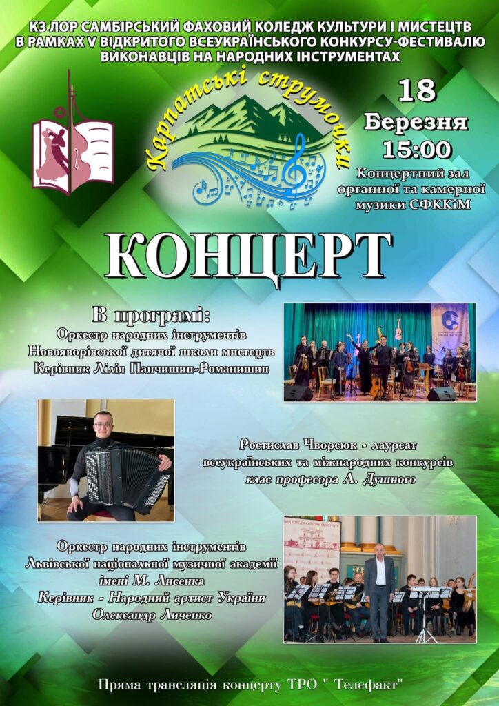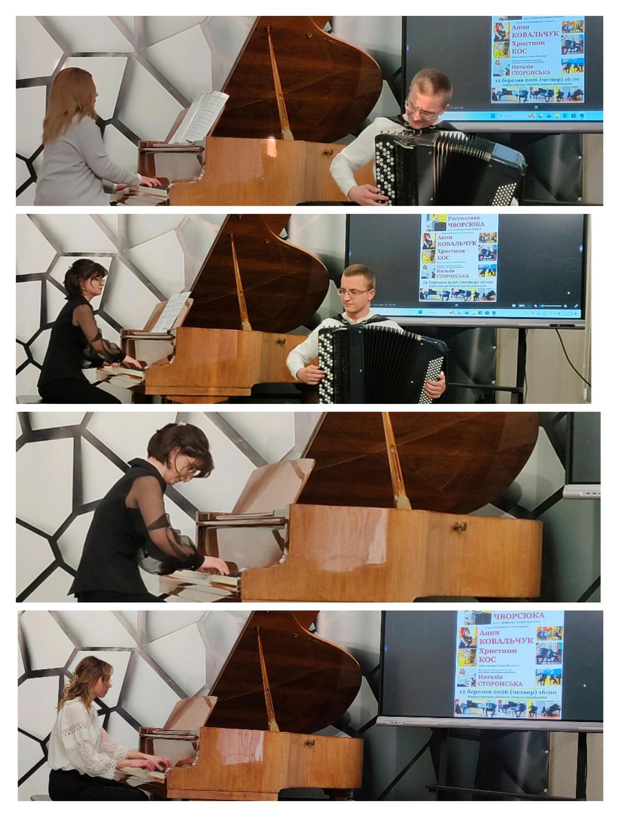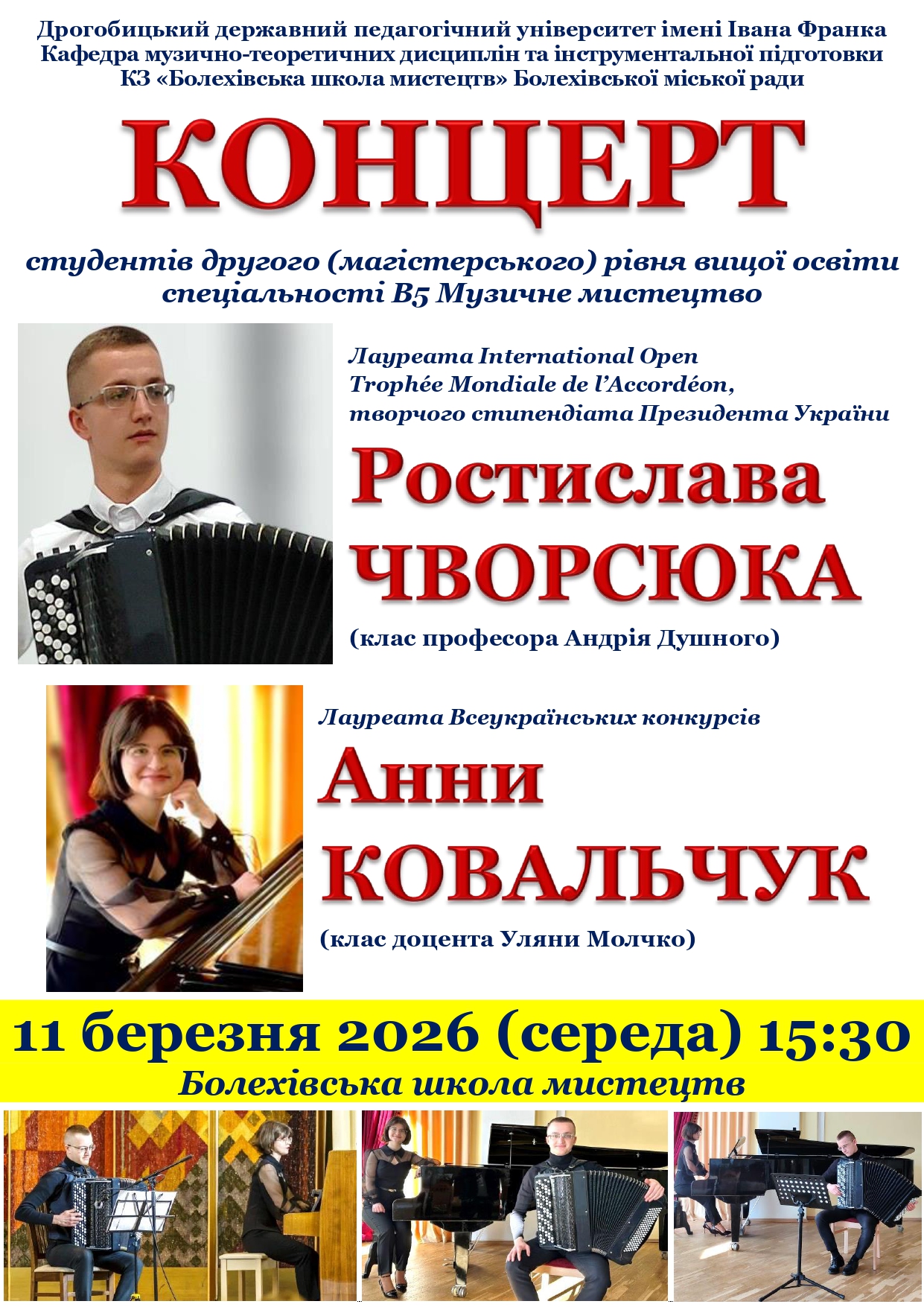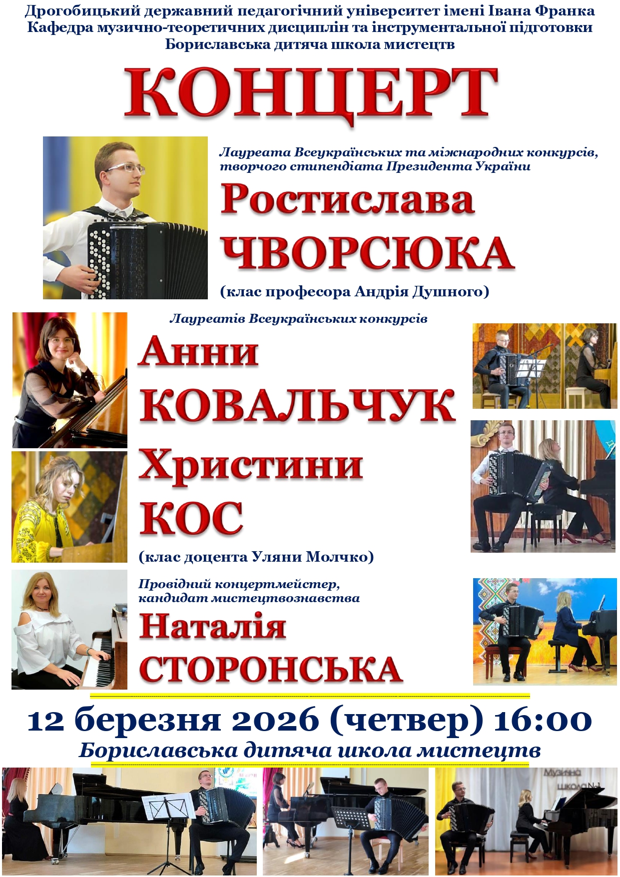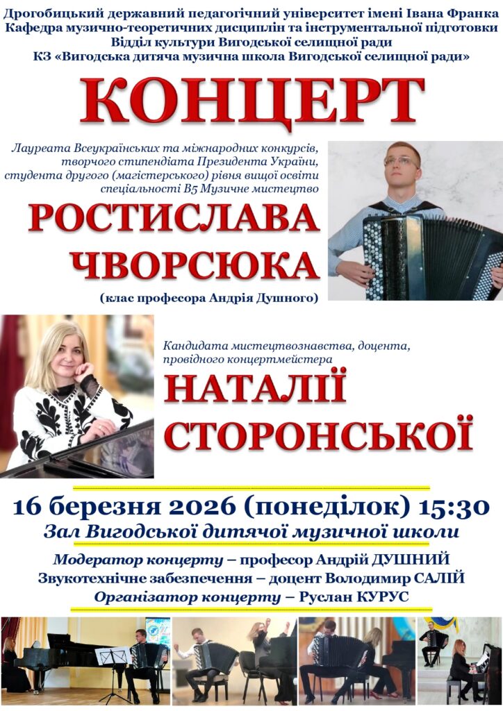 Березневі профагітаційні концерти кафедри музично-теоретичних дисциплін та інструментальної підготовки охопили заклади початкової мистецької освіти та фахової передвищої освіти Івано-Франківської і Львівської областей. Творча команда на чолі із завідувачем кафедри професором Андрієм Душним здійснила цілий концертний тур. Програми підготували студенти другого (магістерського рівня) вищої освіти спеціальності В5 Музичне мистецтво Ростислав Чворсюк (баян, клас професора Андрія Душного) й Анна Ковальчук (фортепіано, клас доцентки Уляни Молчко), також студентка першого (бакалаврського) рівня вищої освіти спеціальності А4 Середня освіта (Мистецтво. Музичне мистецтво) Христина Кос (фортепіано, клас доцентки Уляни Молчко).