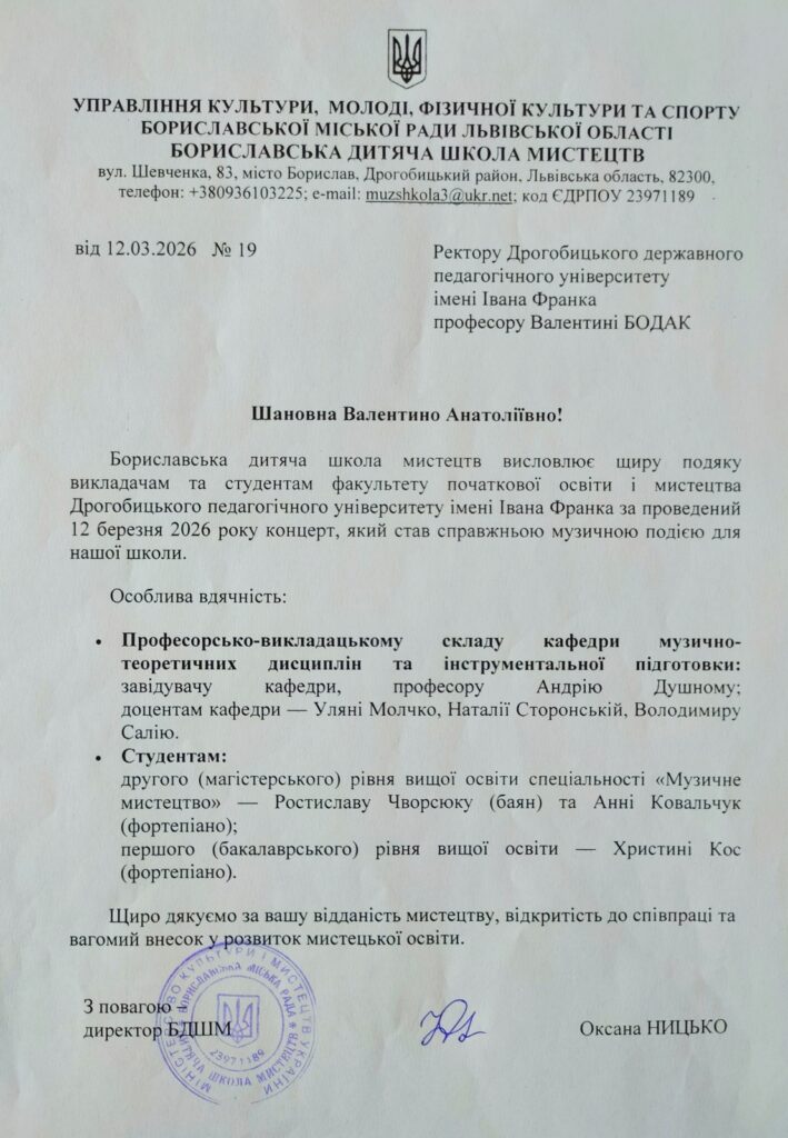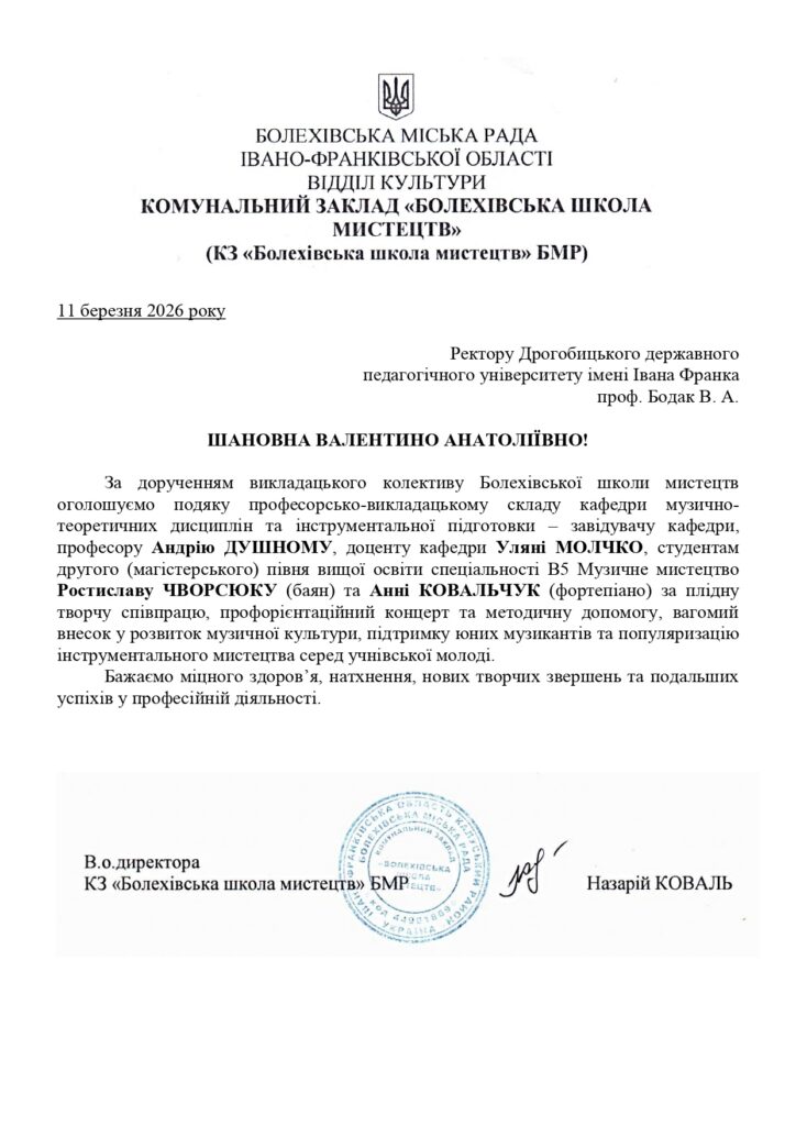 Концерти у КЗ «Болехівська школа мистецтв» Болехівської міської ради (11 березня), КЗ «Вигодська дитяча музична школа Вигодської селищної ради» (16 березня) та Бориславській дитячій школі мистецтв (12 березня) мають давні традиції творчої співпраці. Варто відзначити: директор Болехівської ШМ Назарій Коваль та його заступник Микола Долішній, заступник директора Виготської ДМШ Степан Фіцак і начальник відділу культури Виготської селищної ради Руслан Курус – випускники музично-педагогічного факультету / Інституту музичного мистецтва Франкового університету. Наші випускники працюють і у Бориславській ДШМ, що є свідченням кадрового забезпечення в регіоні.