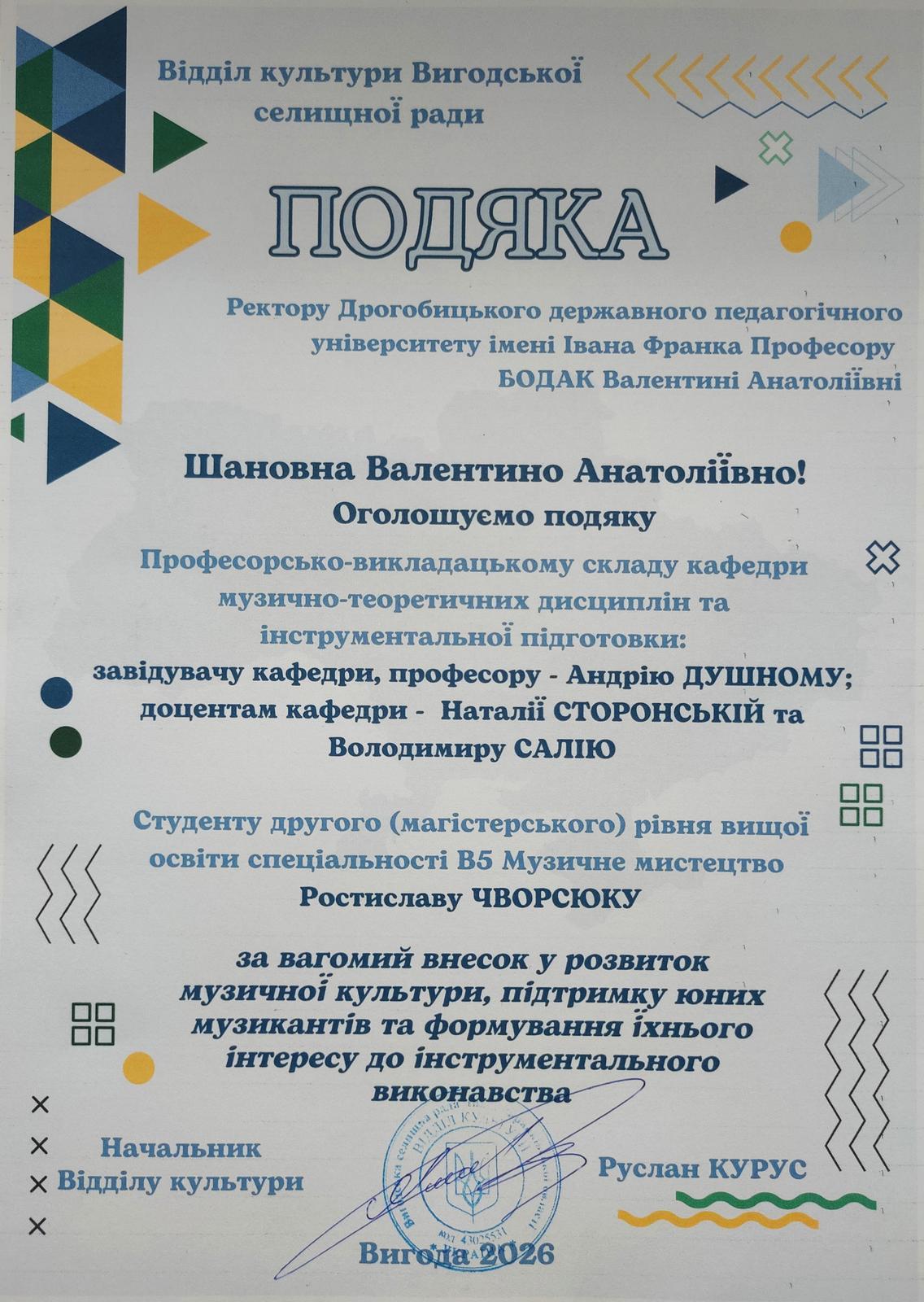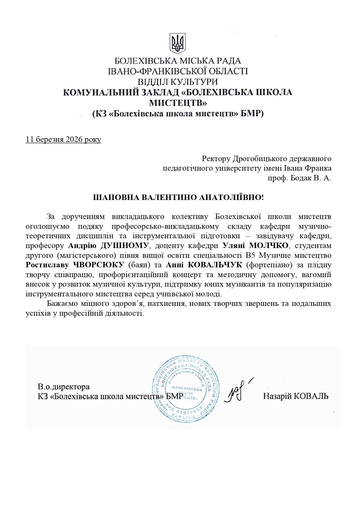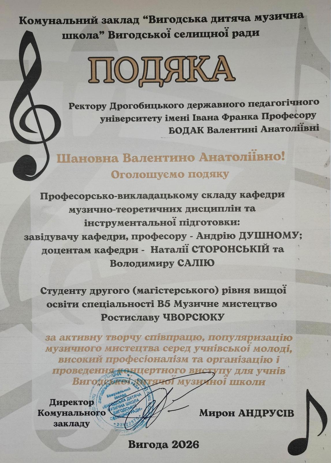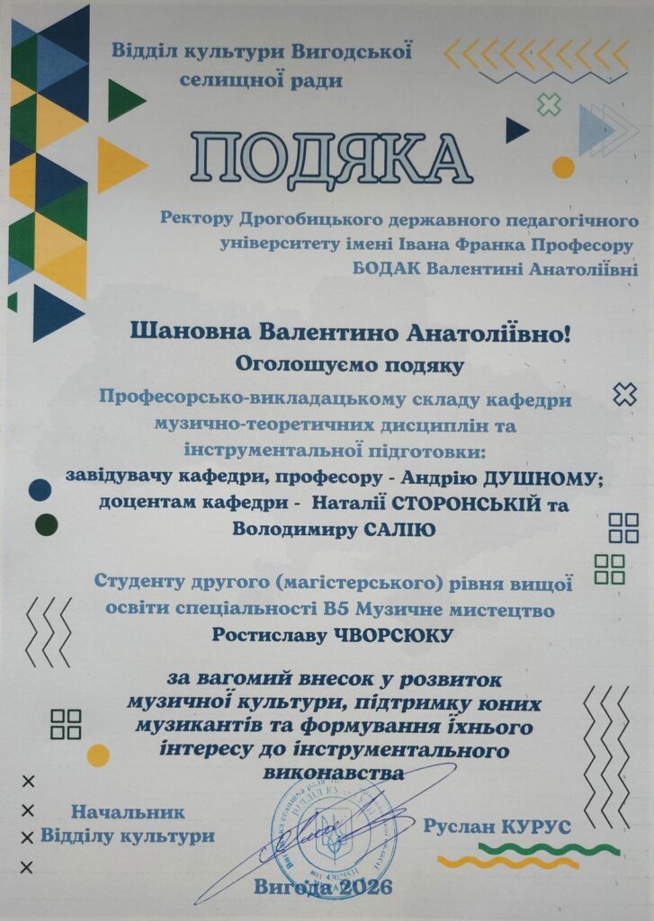 Хочемо щиро подякувати директорам шкіл Назарію Ковалю (Болехів) і Оксані Ницько (Борислав), начальнику відділу культури Руслану Курусу (Вигода), директору Самбірського фахового коледжу культури та мистецтв Роману Красняку за запрошення, багаторічну співпрацю й дружбу.