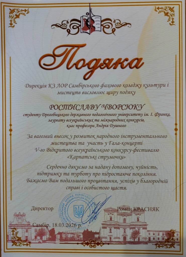 Вагомим концертним підсумком став сольний виступ Ростислава Чворсюка у великому концерті в рамах V Відкритого Всеукраїнського конкурсу молодих виконавців на народних інструментах «Карпатські струмочки» у залі органної й камерної музики Самбірського фахового коледжу культури та мистецтв (18 березня). Оргкомітет конкурсу вже вдруге запрошує Ростислава із сольним концертом. Декілька творів Ростислав виконав у дуеті з Анною Ковальчук і Наталією Сторонською. До складу журі цього конкурсу було запрошено професора Андрія Душного.