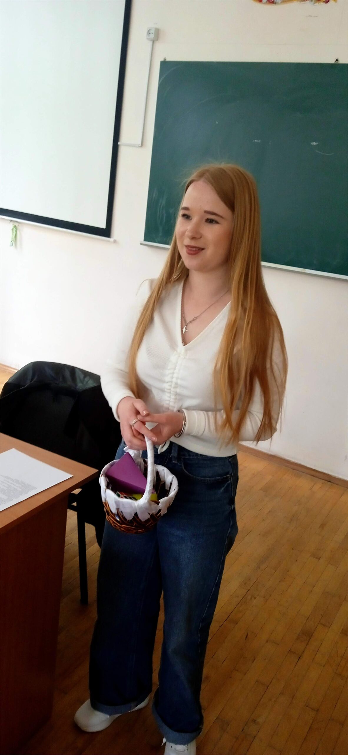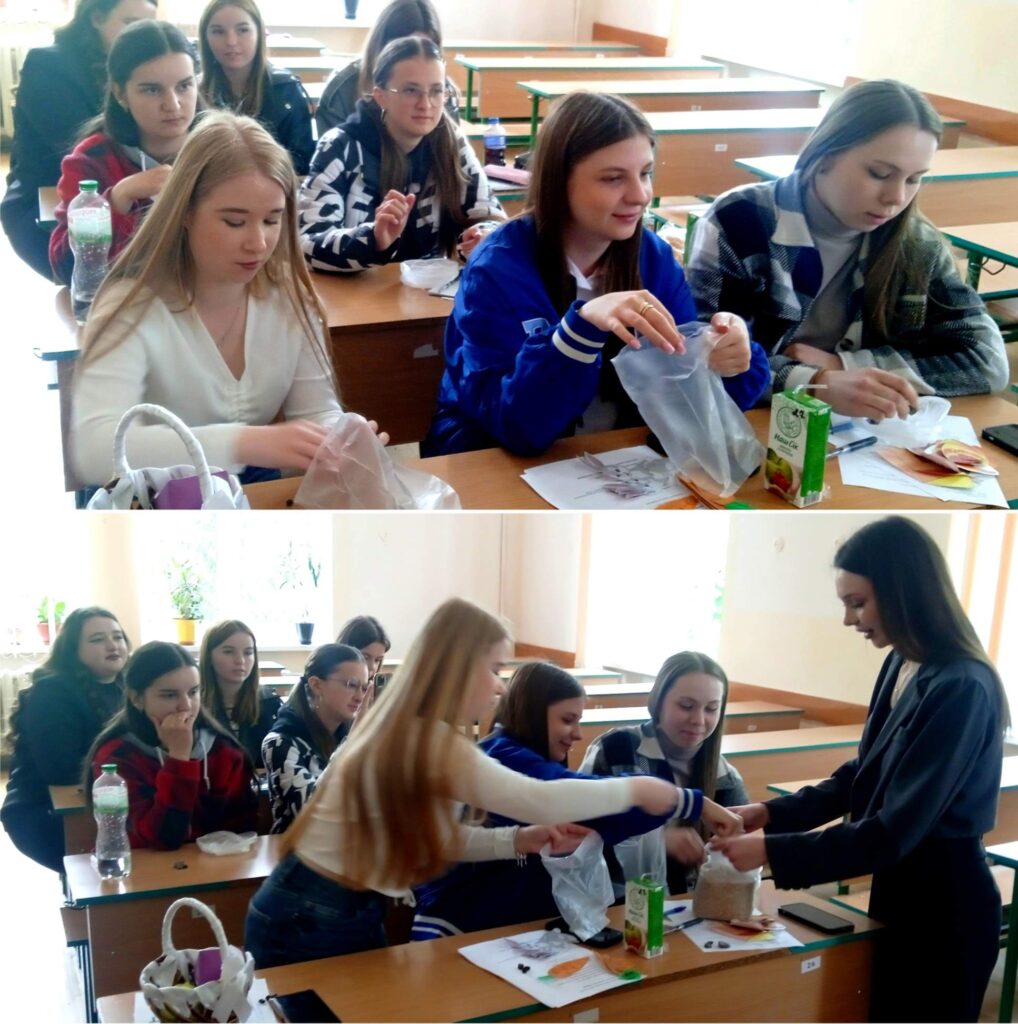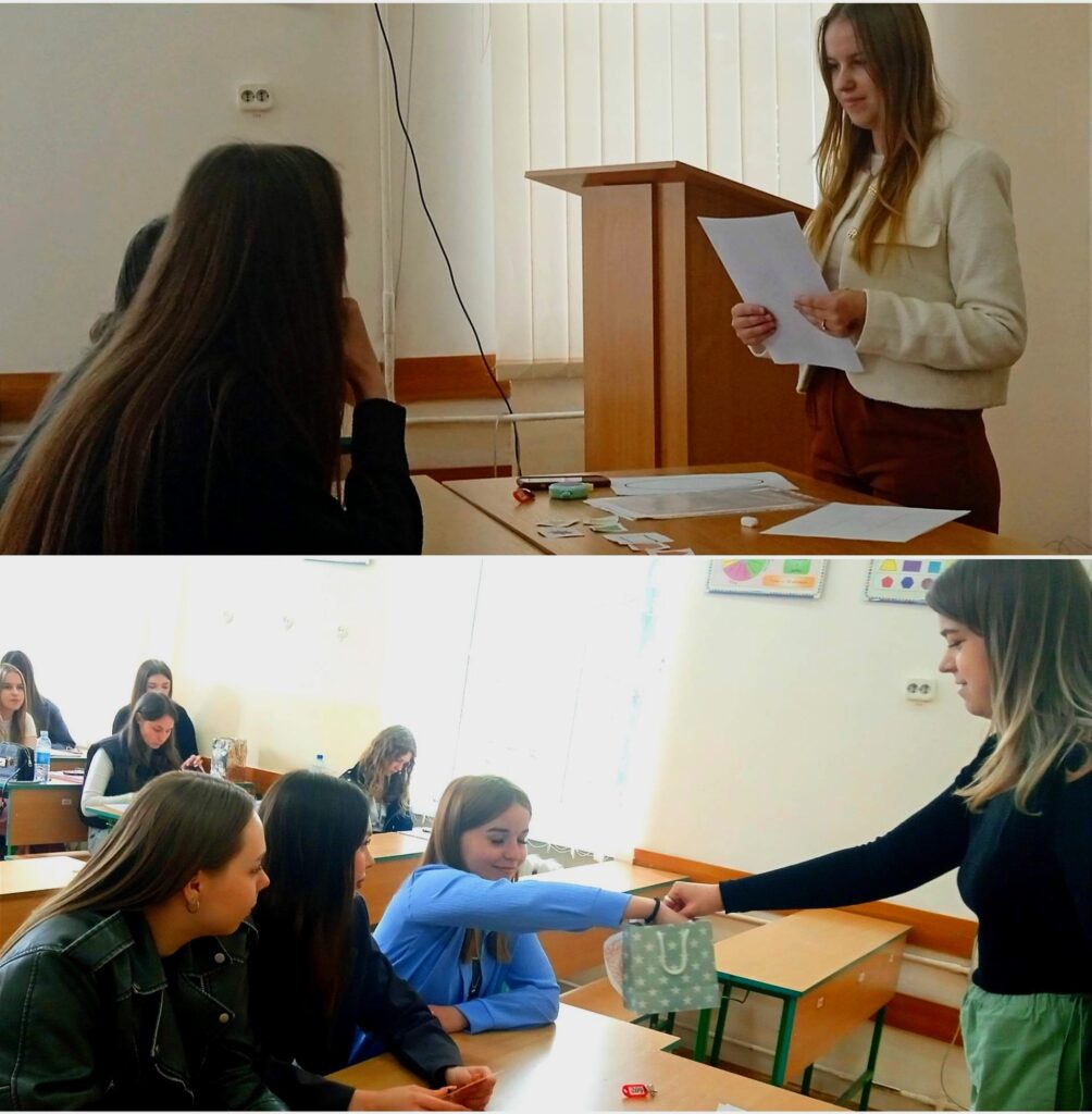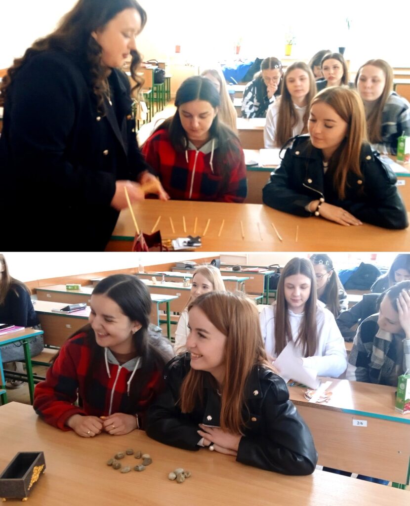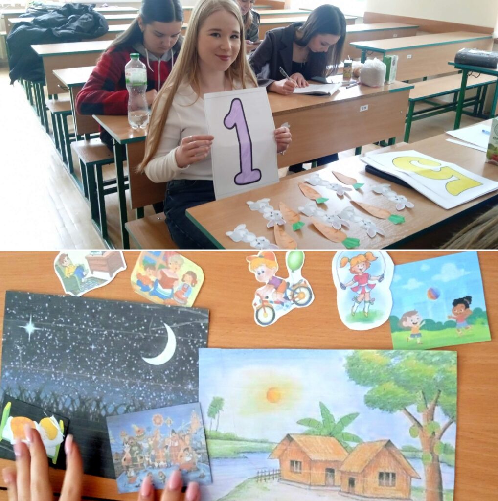 Яна Копильчакпідготувала цікавий роздатковий матеріал та провела із студентами дидактичну гру «День, ніч», завдяки чому «дошкільнята» могли: розрізняти та називати відрізки доби (ранок, обід, вечір, ніч), розглядаючи підготовлені малюнки, розповідати, який вид діяльності відбувається у певну частину доби; проведення різних свят, традицій та звичаїв у певну пору року (Різдвяний вертеп, Свято матері тощо).