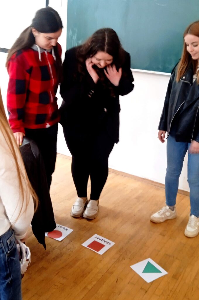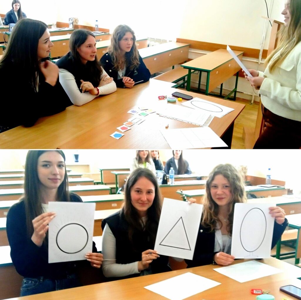 Заняття «Фігурки навколо нас» провела Соломія Кордіяка(гр. Б1). Студенти під її керівництвом знаходити зображення на картинках, в аудиторії предмети, які схожі на певну геометричну фігуру; грали гру «Хто швидше підійде до названої фігури», а також відгадували фігурки, які по черзі витягували з коробки.