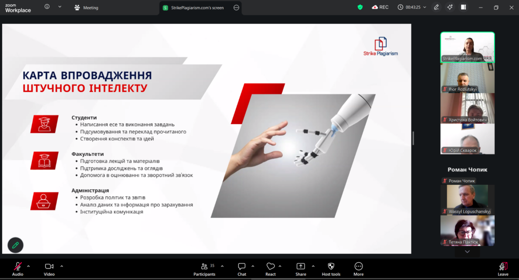 Доречно зазначити, що ця актуальна зустріч була зініційована проректором з науково-педагогічної роботи та інформатизації, кандидатом технічних наук, доцентом Юрієм Скварком, позаяк в контексті прийняття закону України «Про академічну доброчесність» постали нові виклики перед науковою спільнотою. Насамперед мова йде про використання можливостей штучного інтелекту в освітньому середовищі.