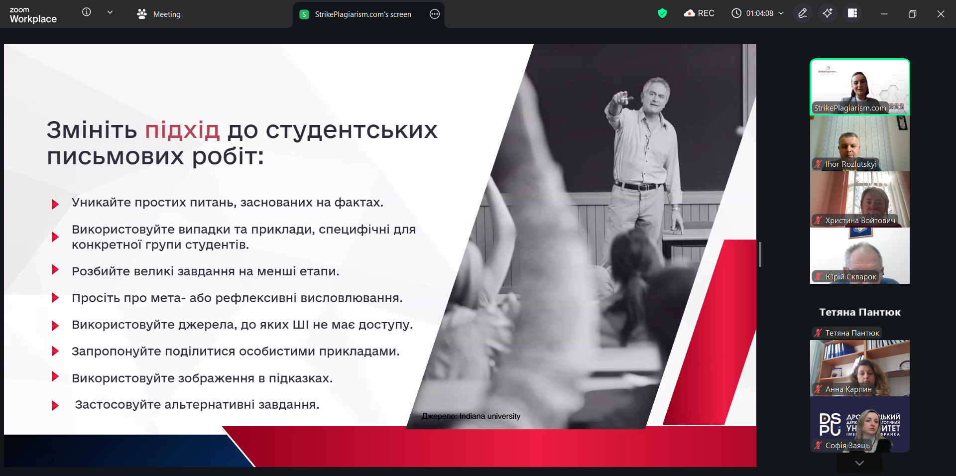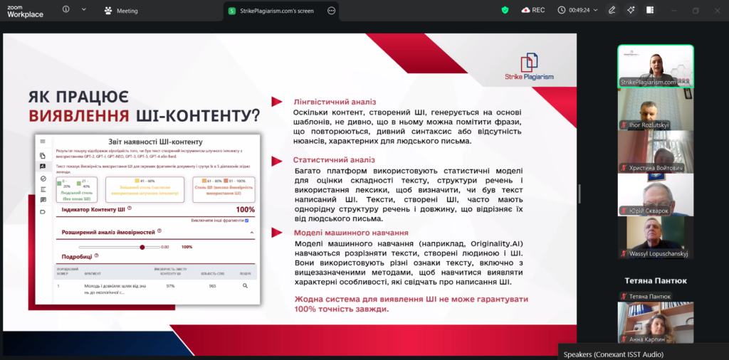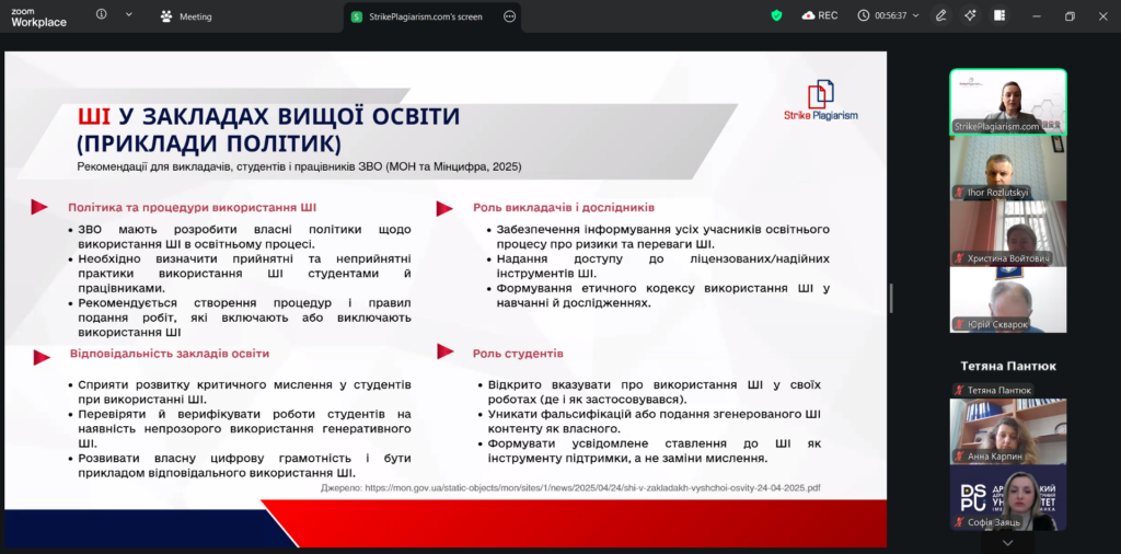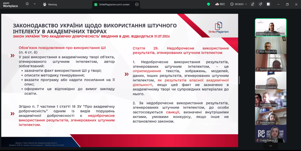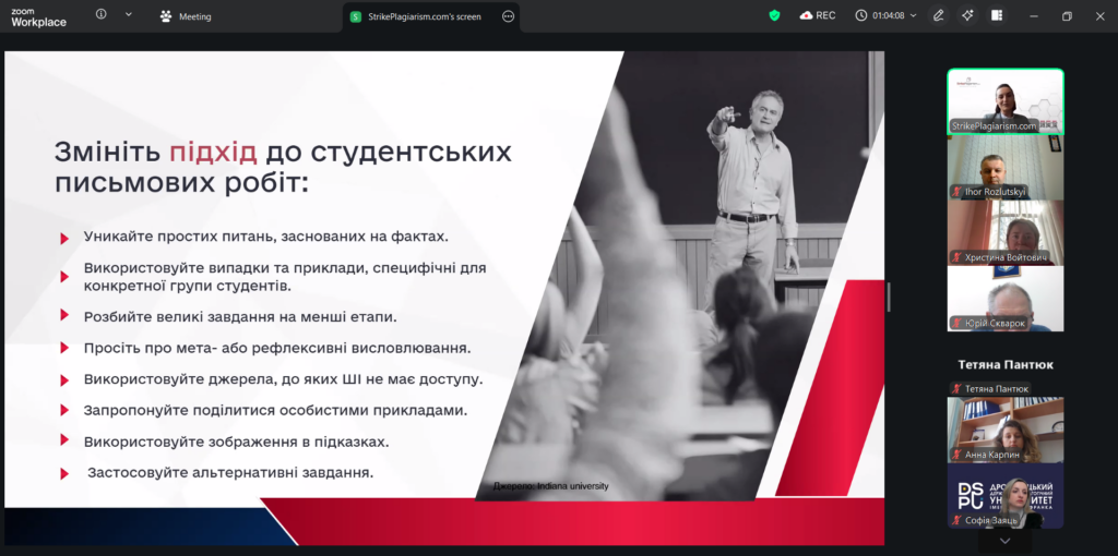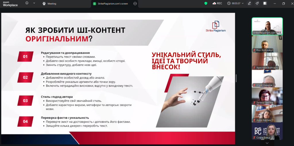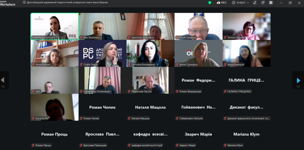 6 квітня в Дрогобицькому державному педагогічному університеті імені Івана Франка разом з організацією SrikePlagiarism відбувся вебінар на тему «Презентація оновленої системи StrikePlagiarism.com» за участі представниці компанії: менеджерки з розвитку Дар’ї Іванової.
